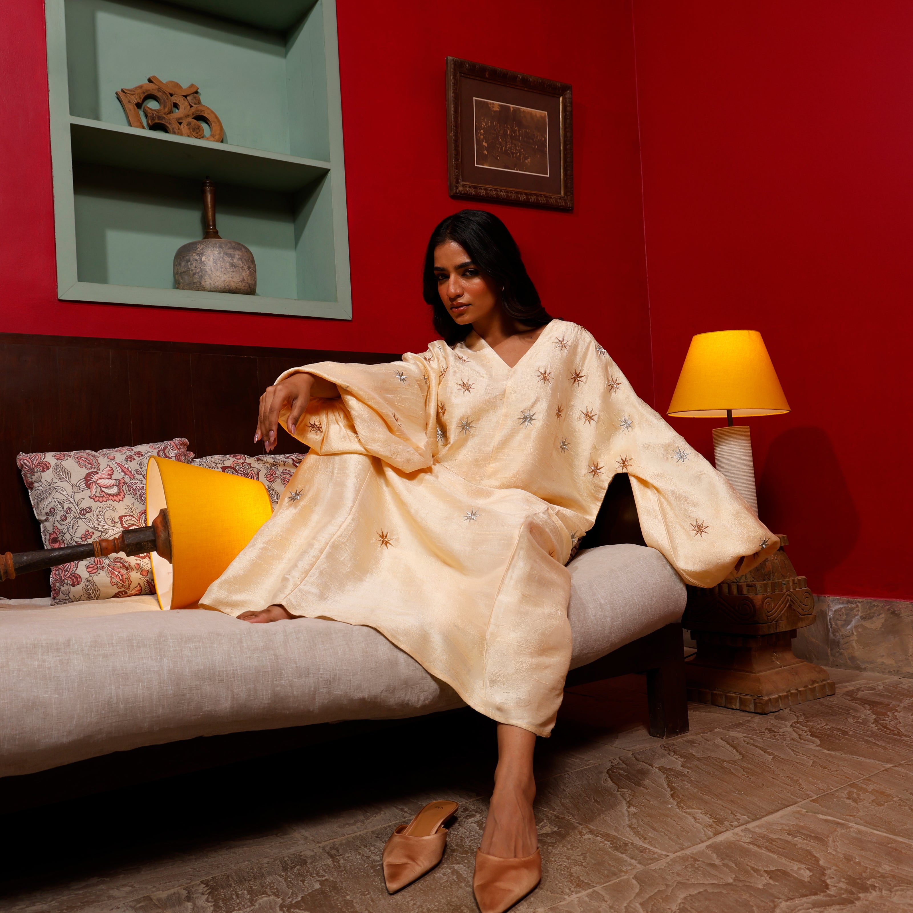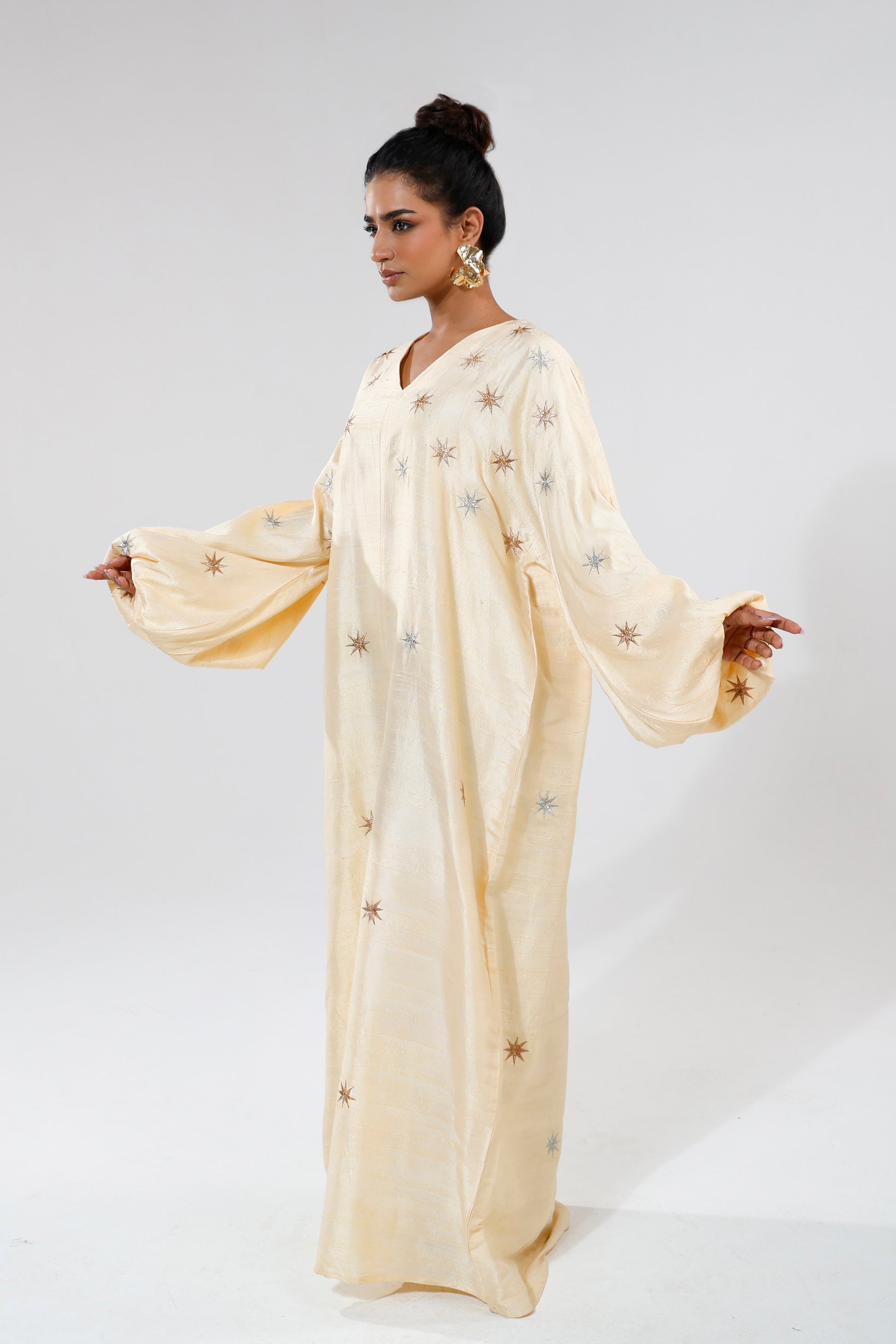 A loose-fitting raw silk dress in a soft light peral ivory, finished with puffed long sleeves and delicate embroidery across the surface. Gentle in movement and texture, it carries a warm and inviting presence.