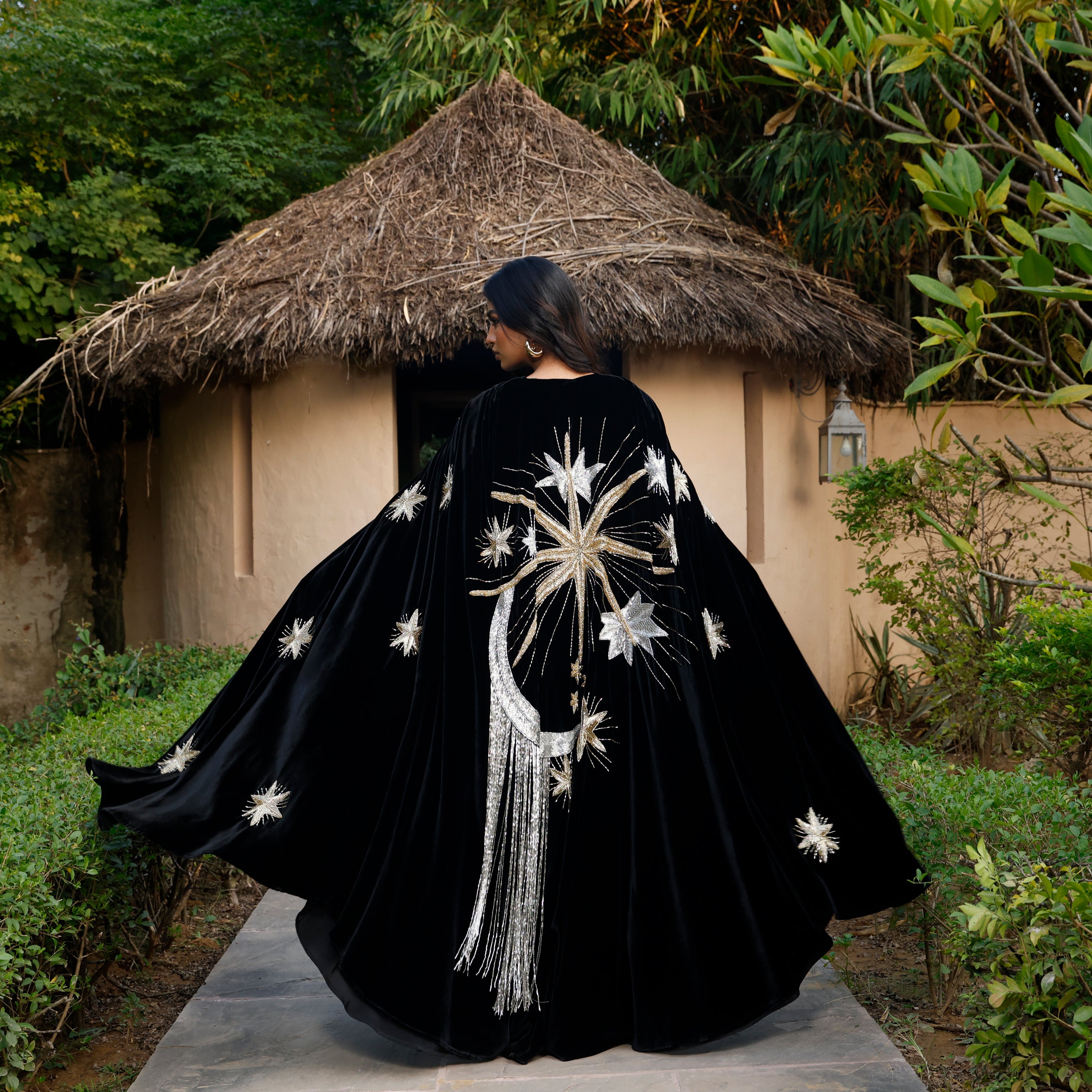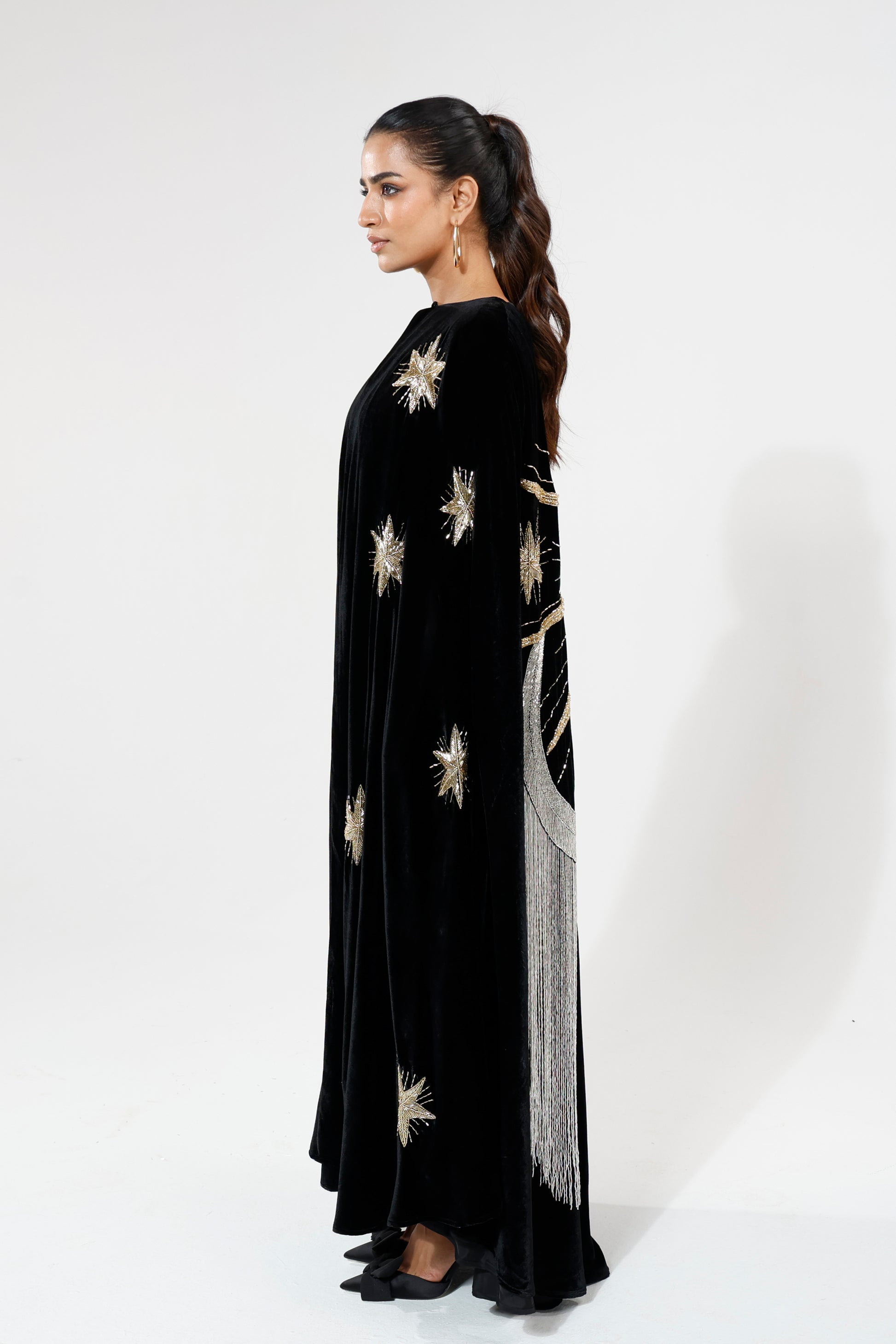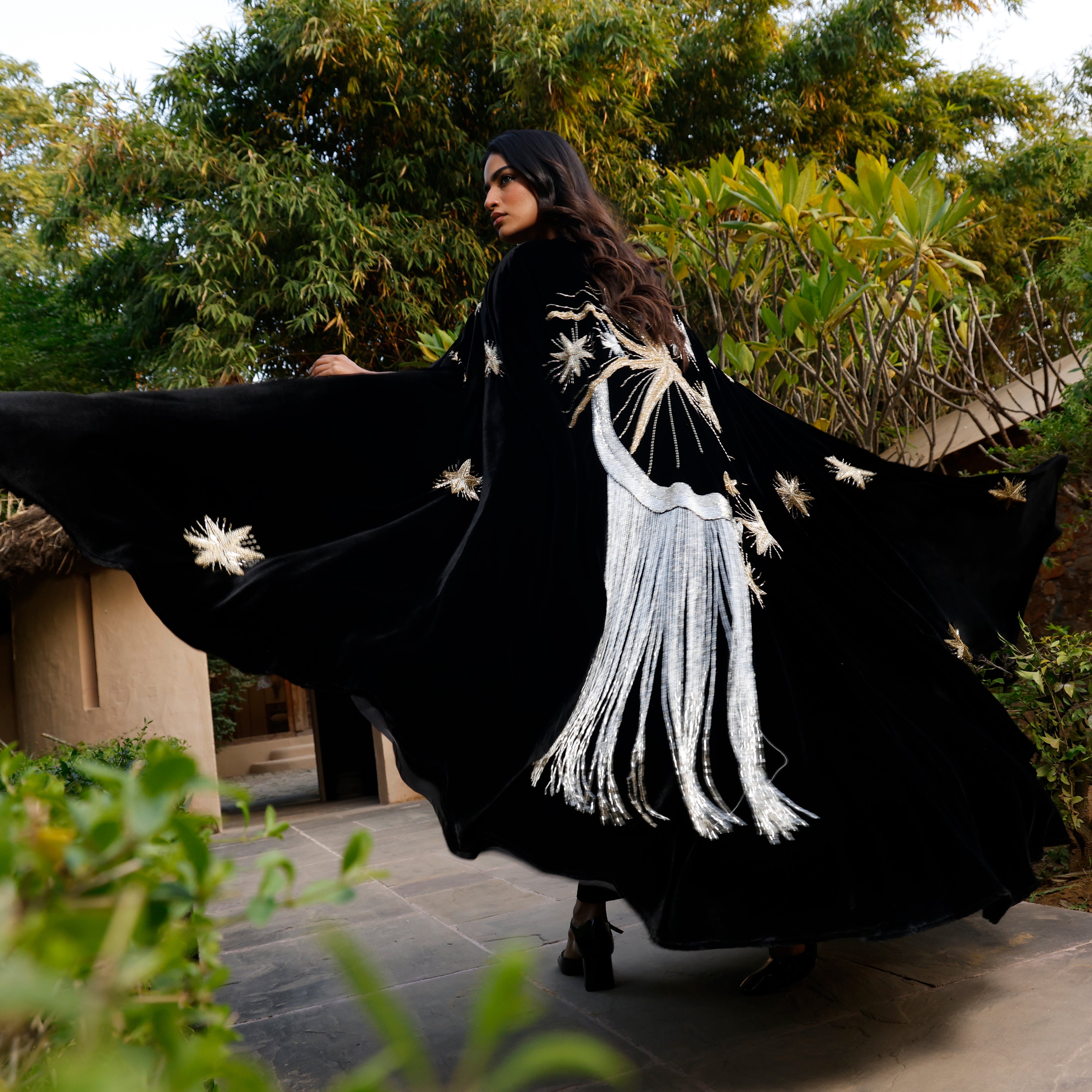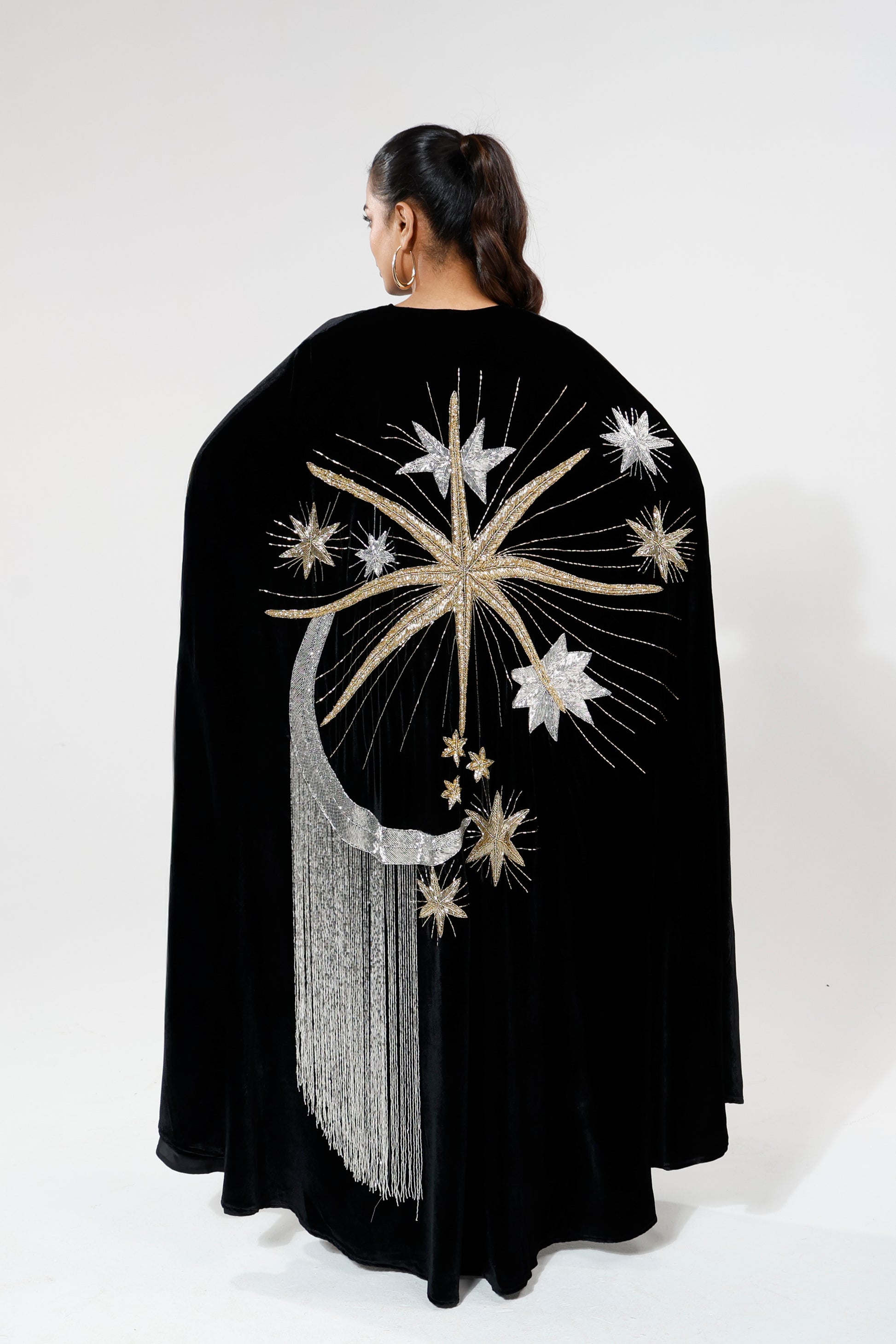 A velvet cape-style piece with intricate beaded and embroidered motifs across the back, finished with delicate beaded tassels and refined front detailing. Majestic and luminous when worn, it moves with fluid drama, creating a presence both magical and graceful.
