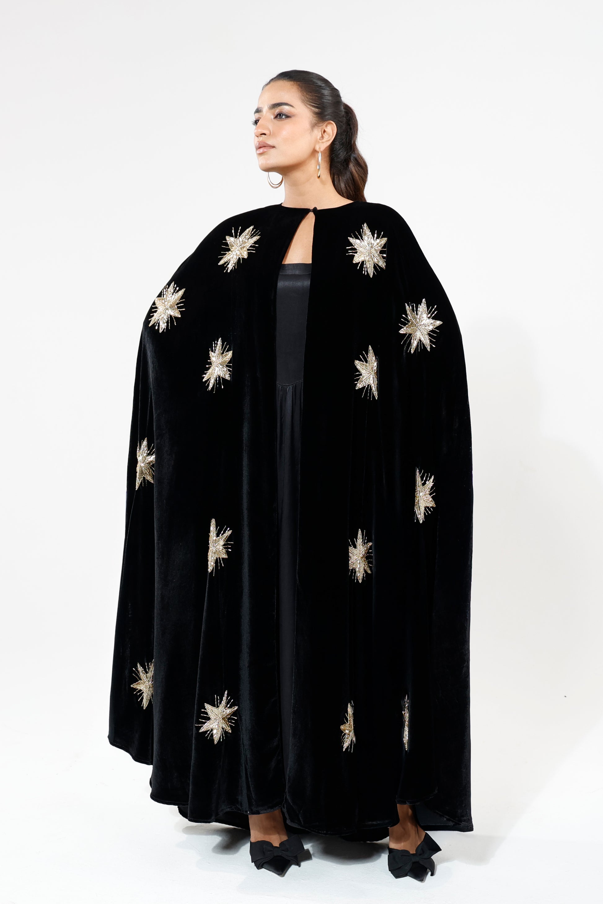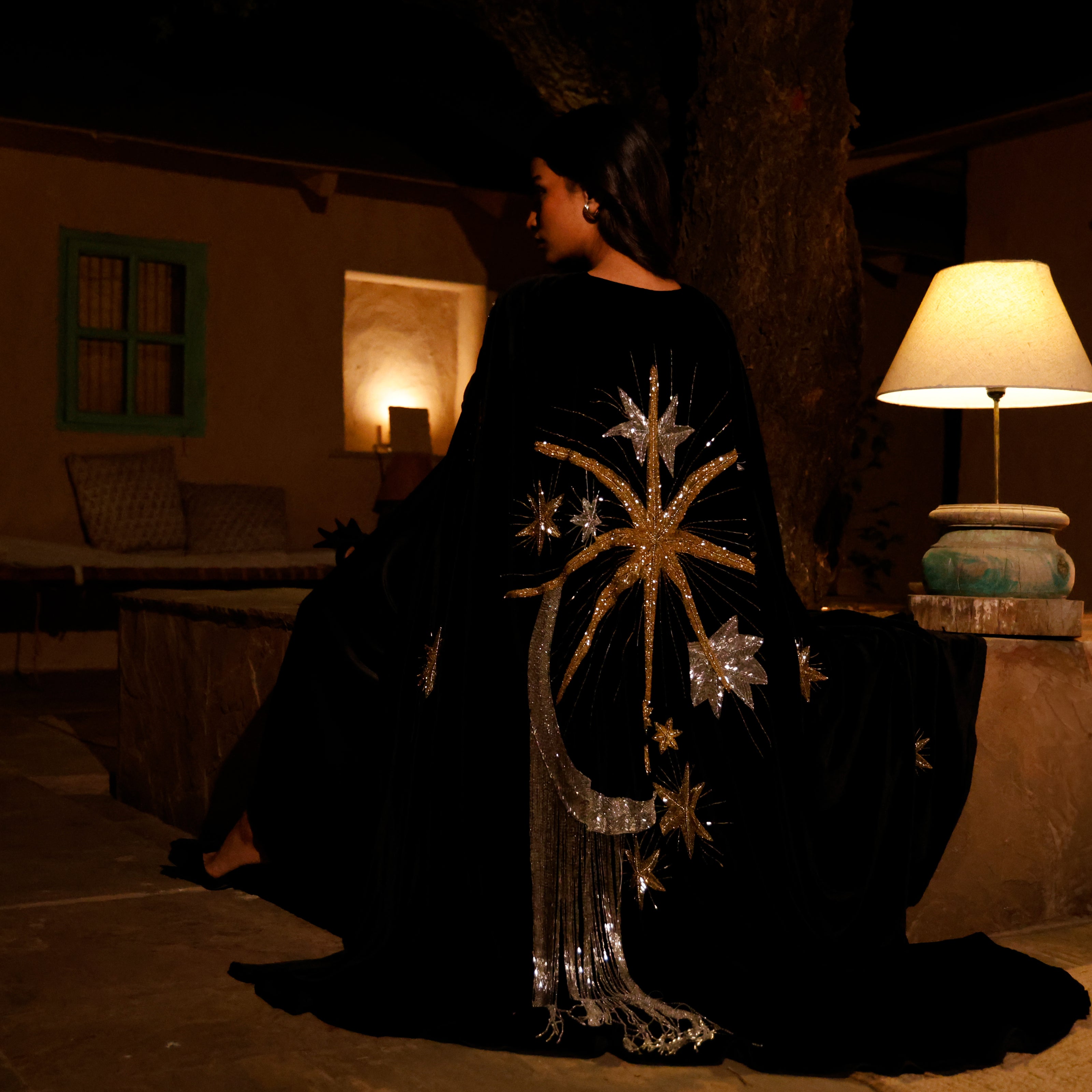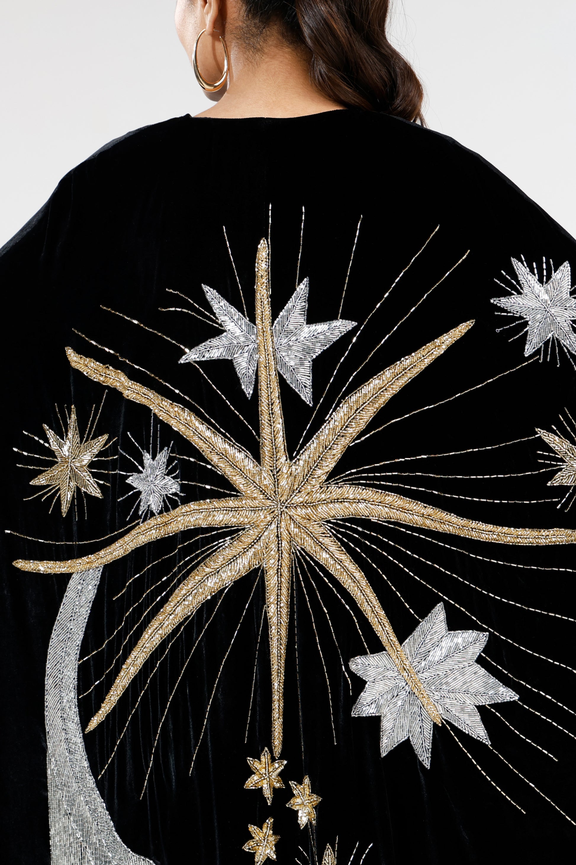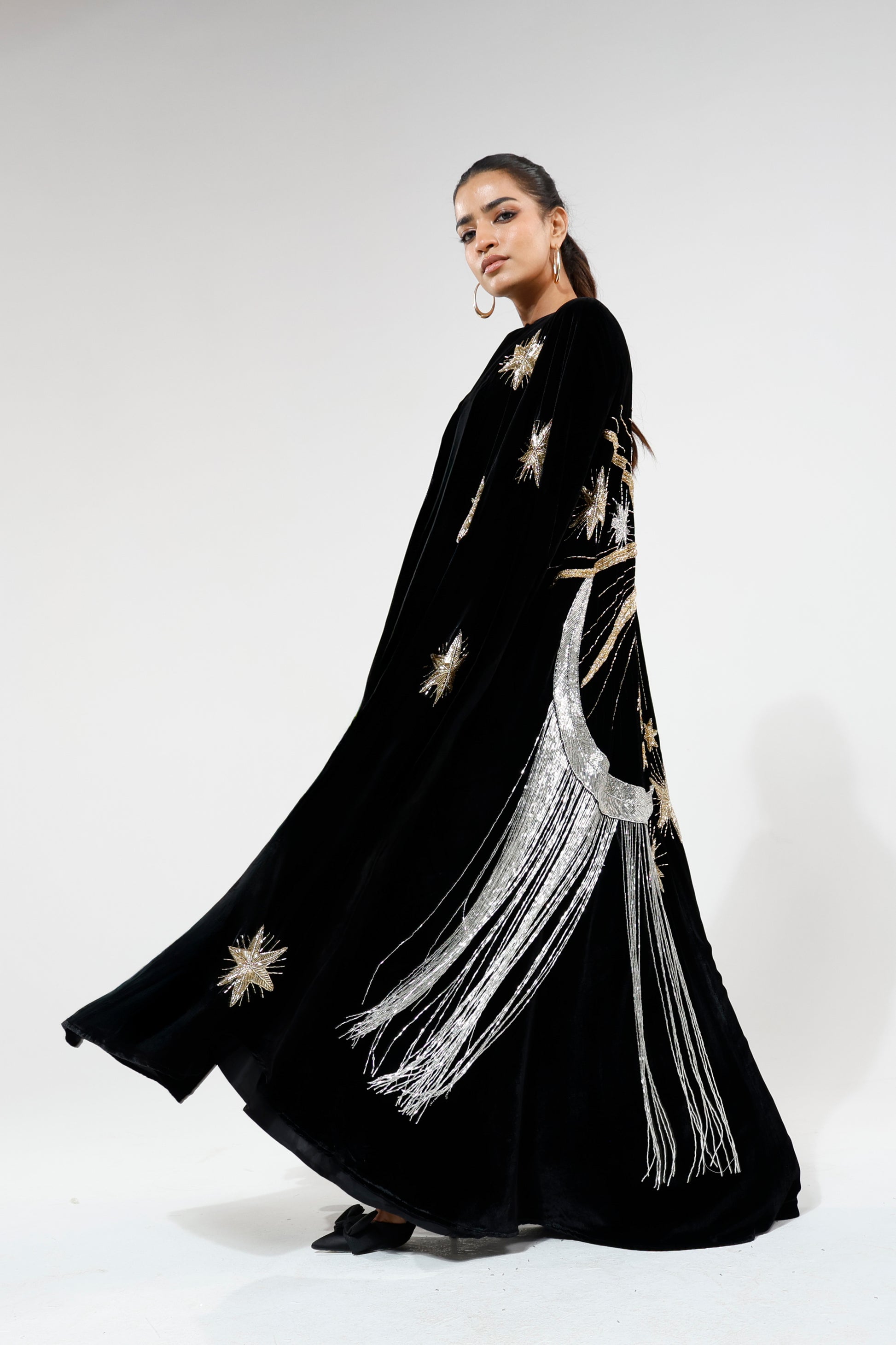 A velvet cape-style piece with intricate beaded and embroidered motifs across the back, finished with delicate beaded tassels and refined front detailing. Majestic and luminous when worn, it moves with fluid drama, creating a presence both magical and graceful.