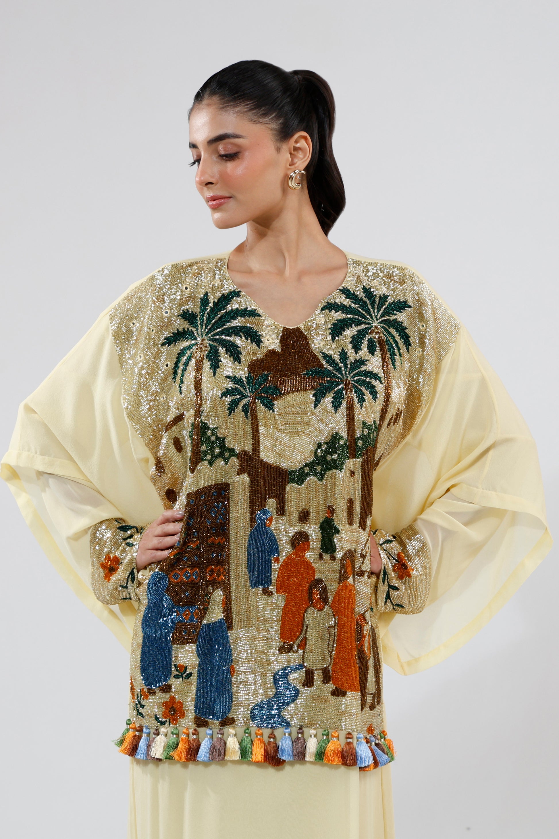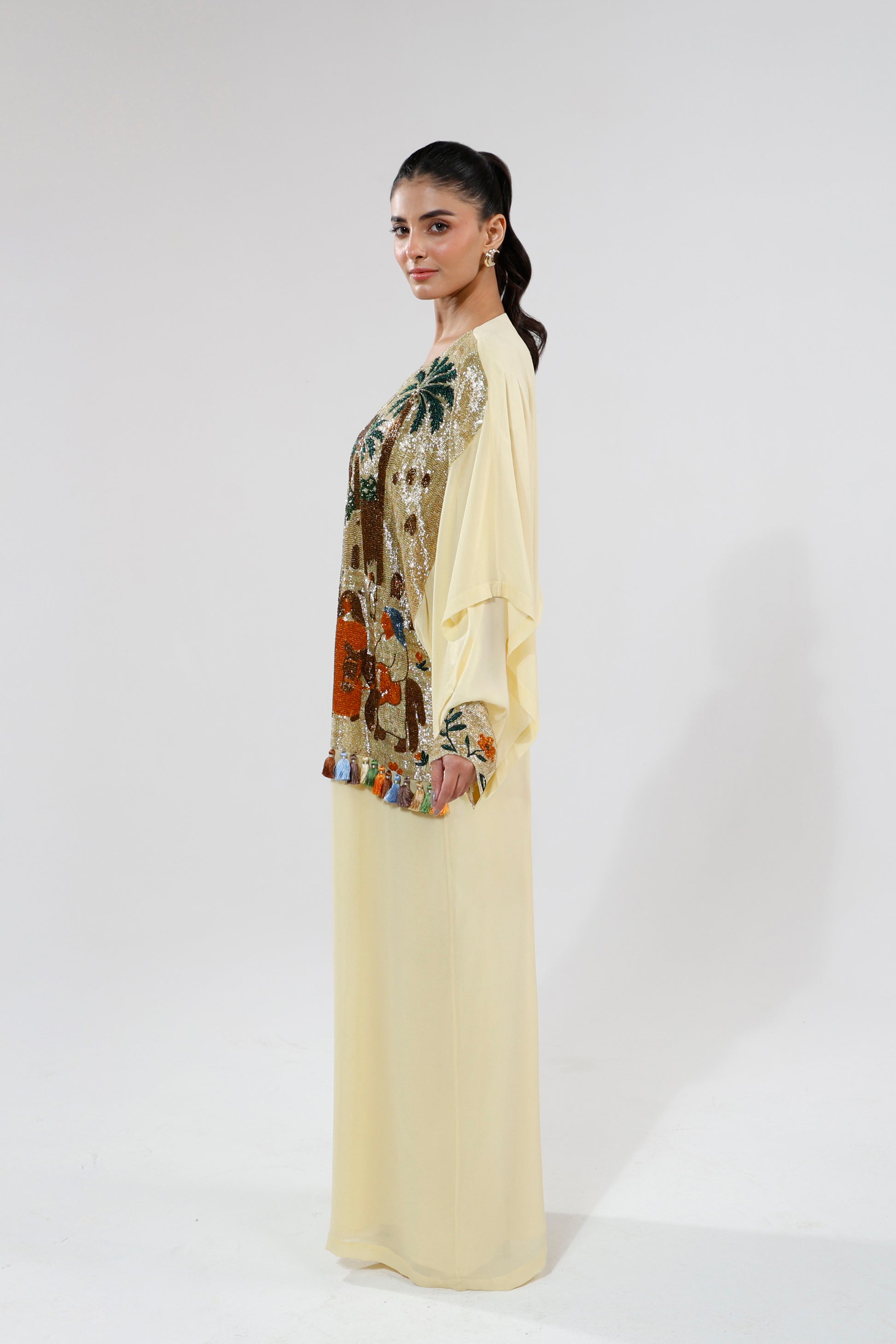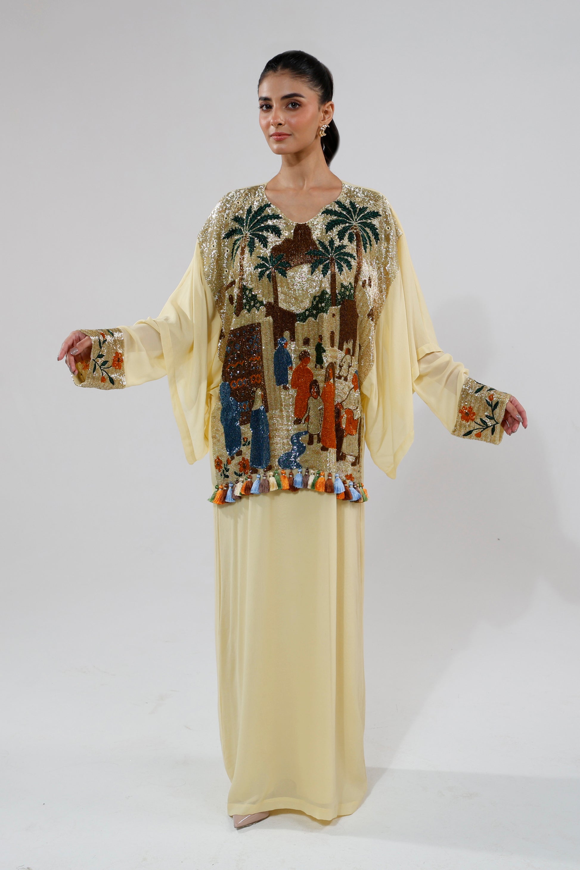A buttercream, loose-fitting silk dress layered with an attached lining, featuring intricate beading along the front and delicate accents at the cuffs. Flowing on the outside and more structured beneath, it creates a rich interplay of movement, texture, and depth.