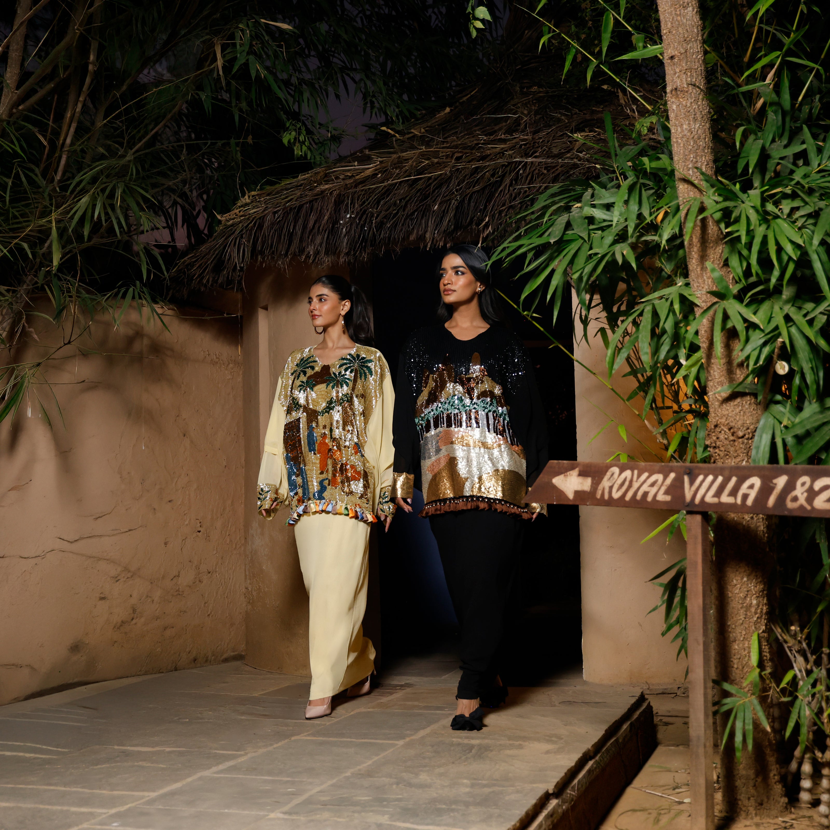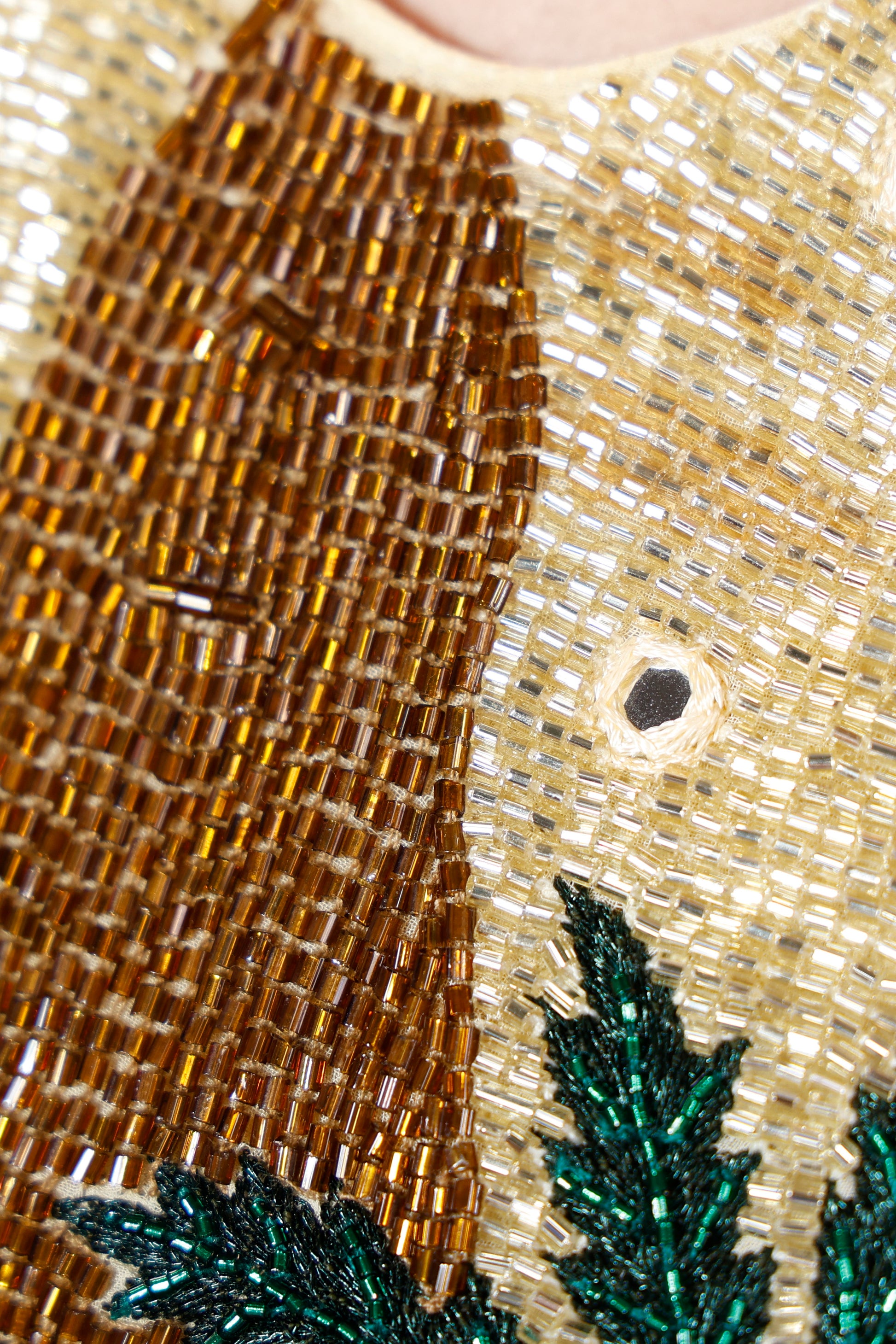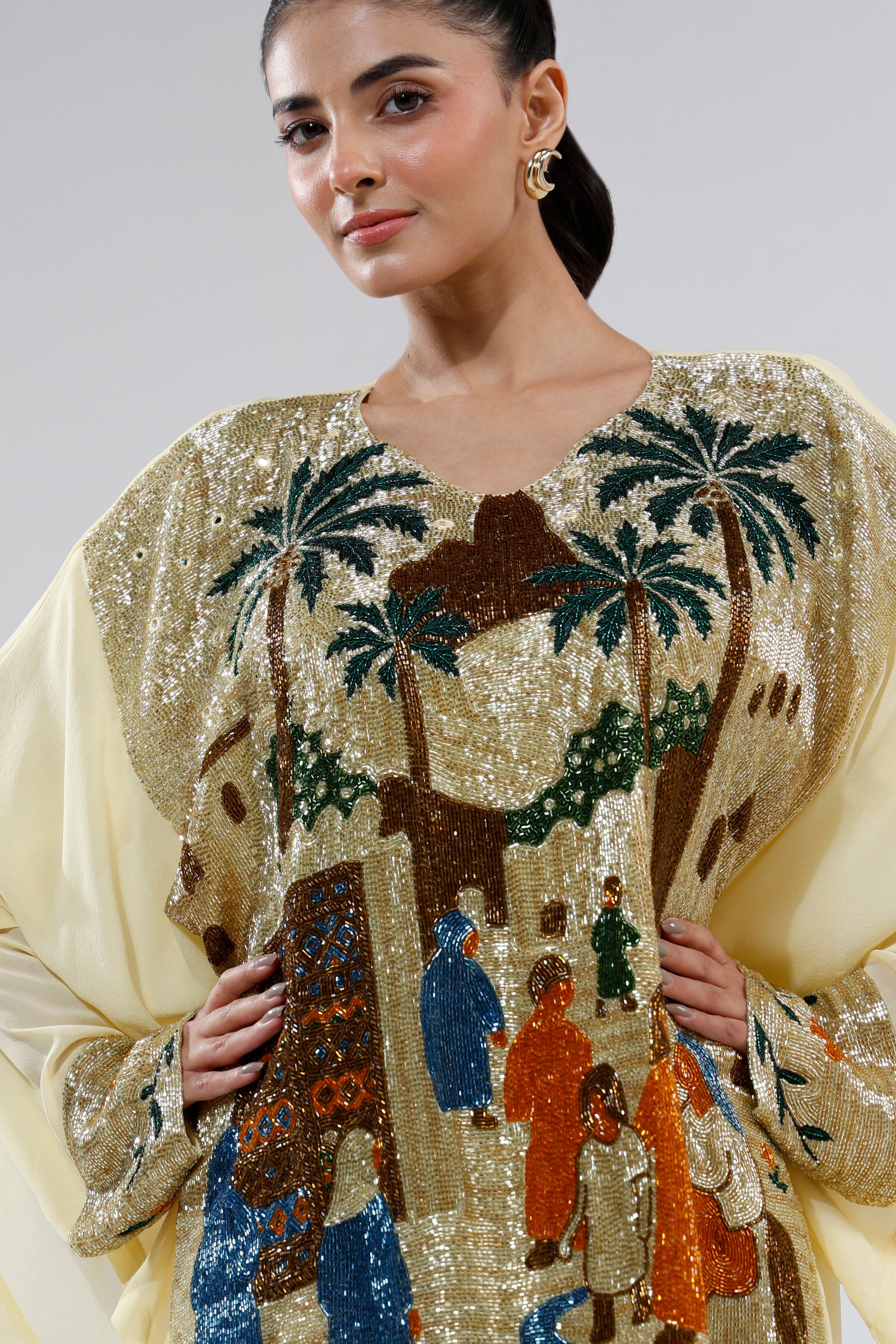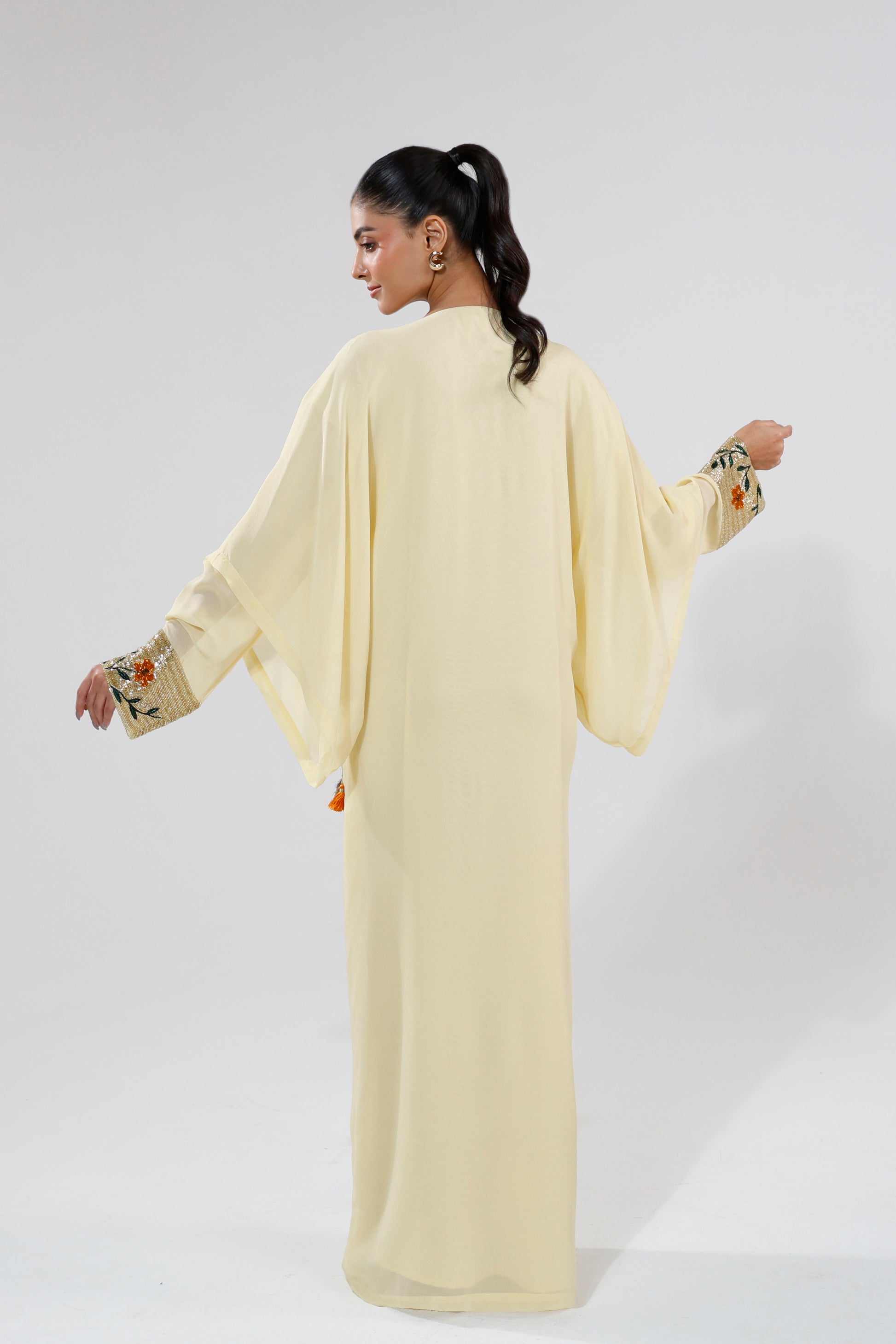 A buttercream, loose-fitting silk dress layered with an attached lining, featuring intricate beading along the front and delicate accents at the cuffs. Flowing on the outside and more structured beneath, it creates a rich interplay of movement, texture, and depth.