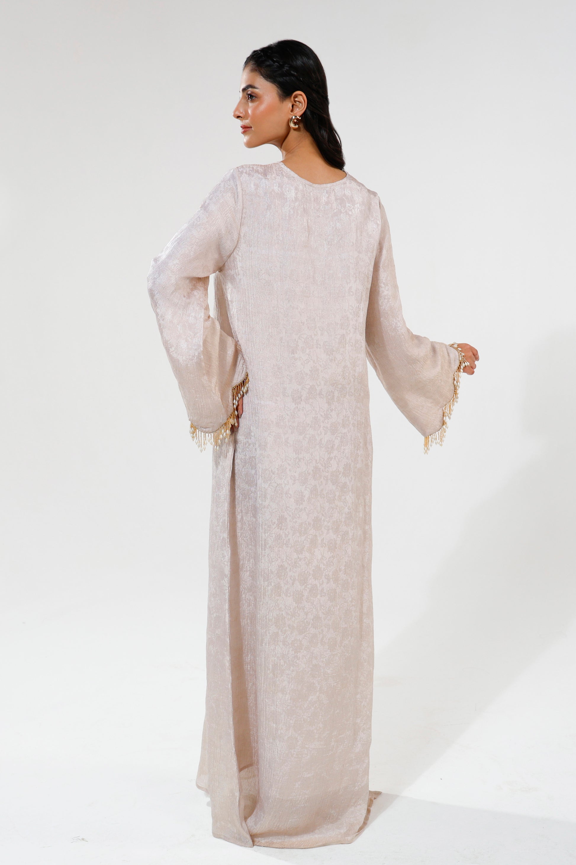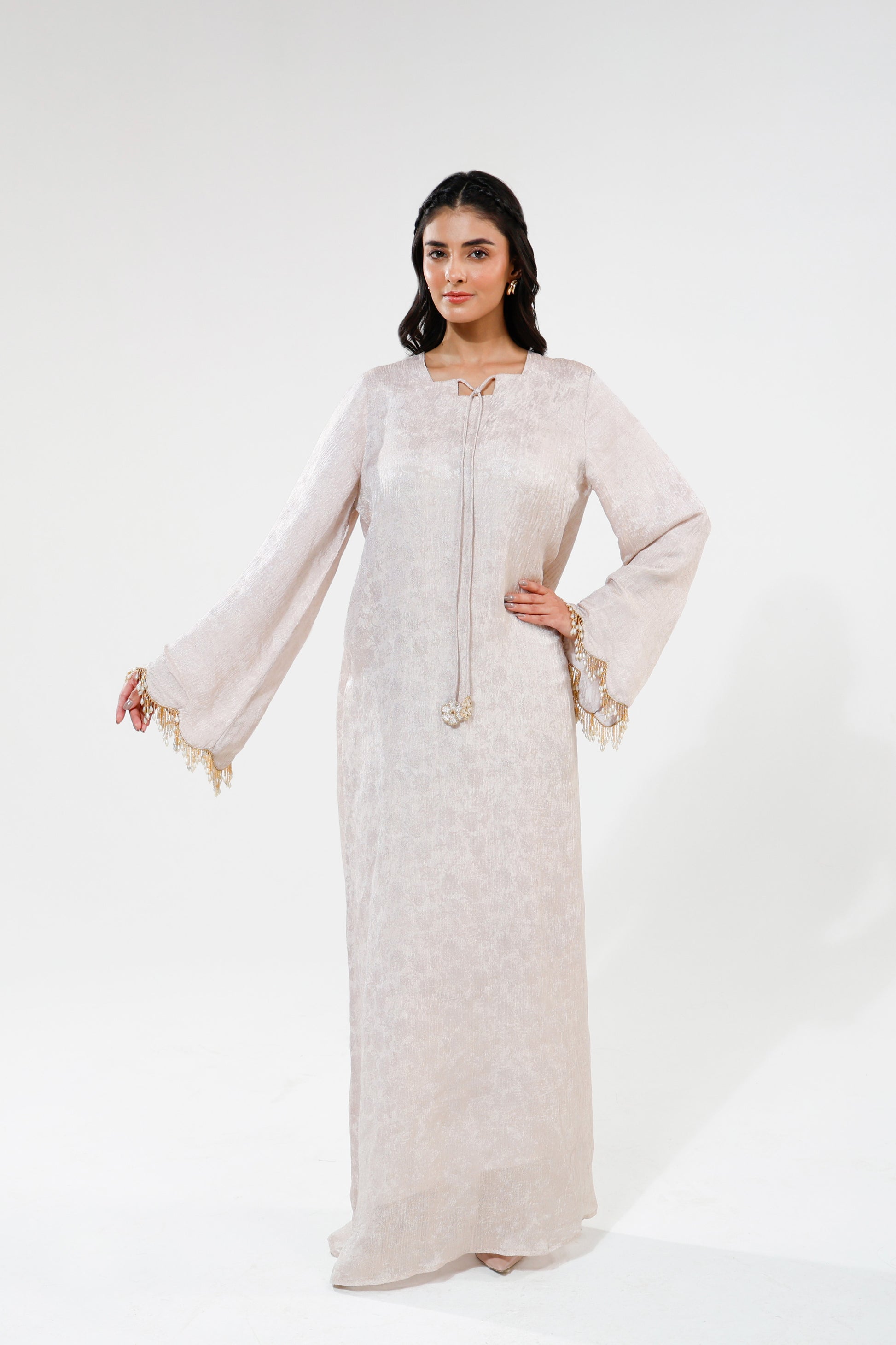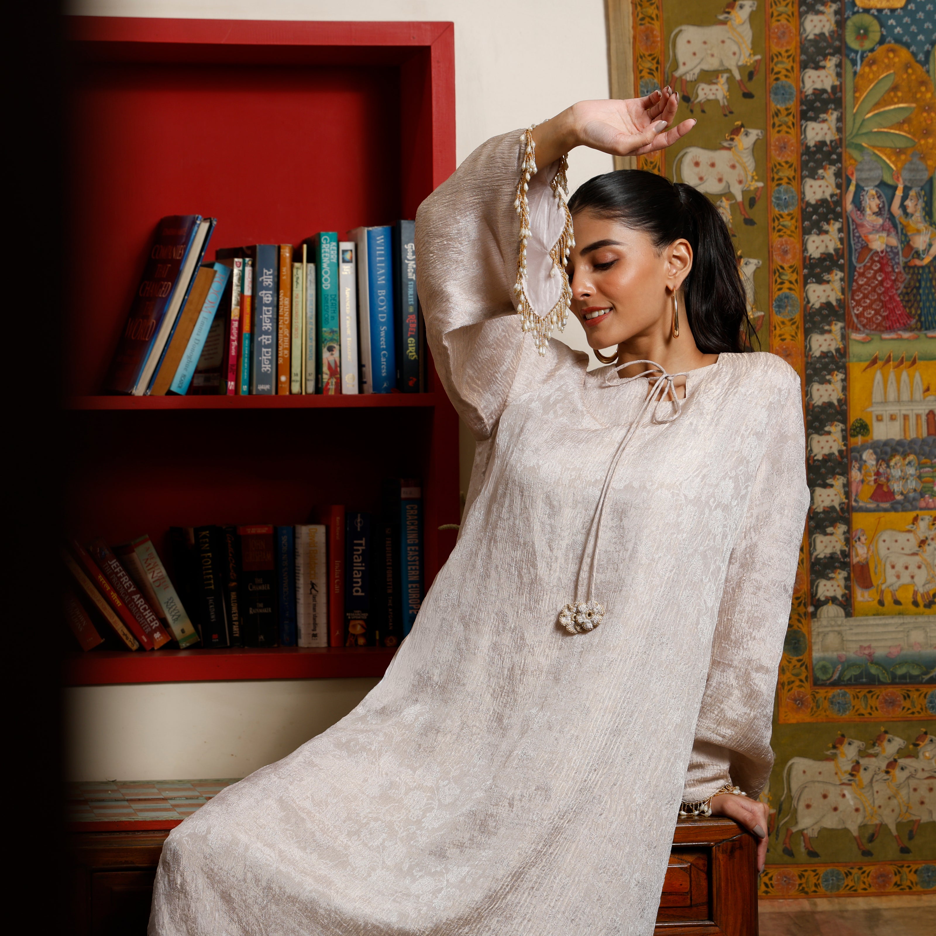 A straight cut mulberry silk, textured light beige dress with a soft square neckline and a subtle opening, finished with a handcrafted crochet tassel. Loose long sleeves with beaded cuff details add movement, creating a calm, fluid, and peaceful look.
