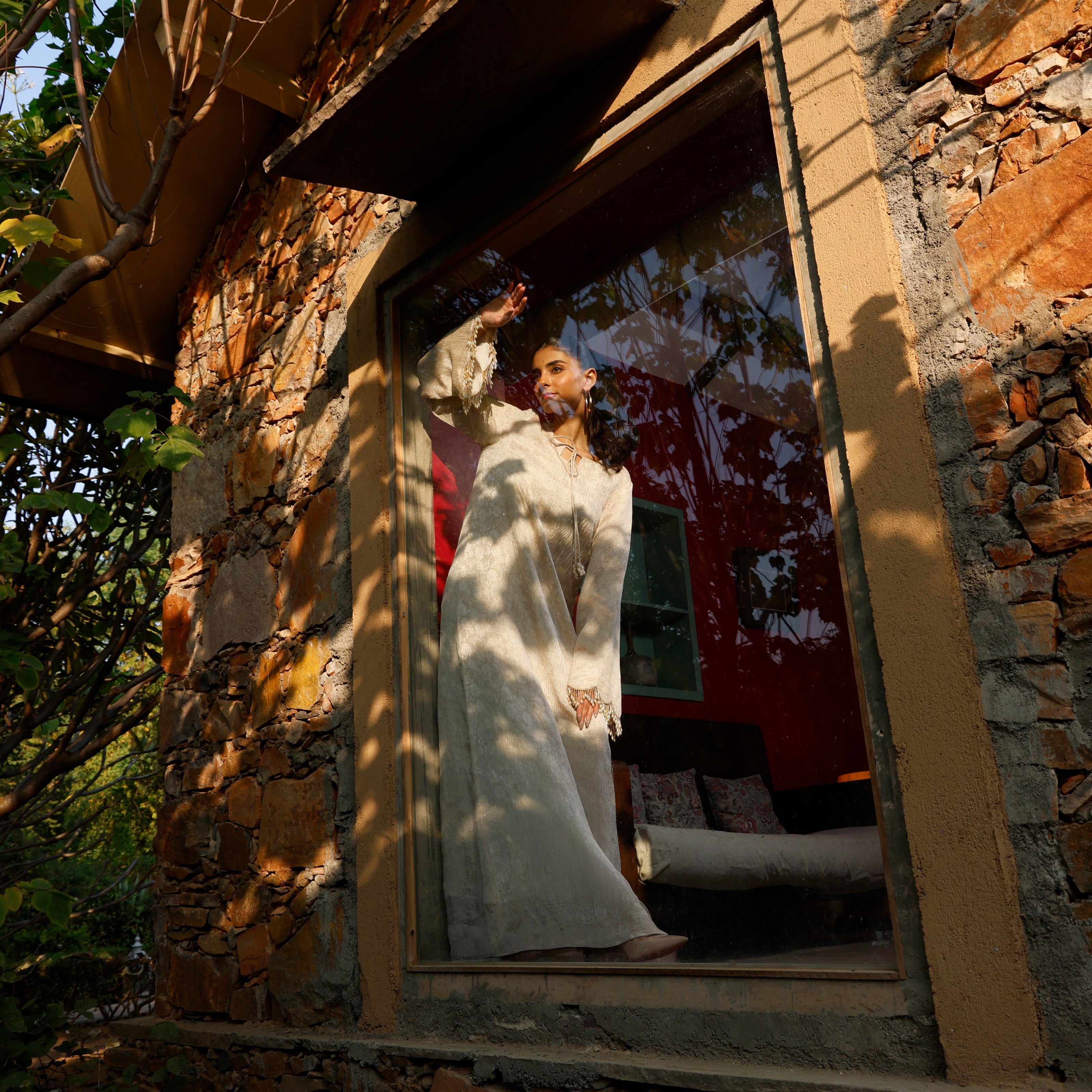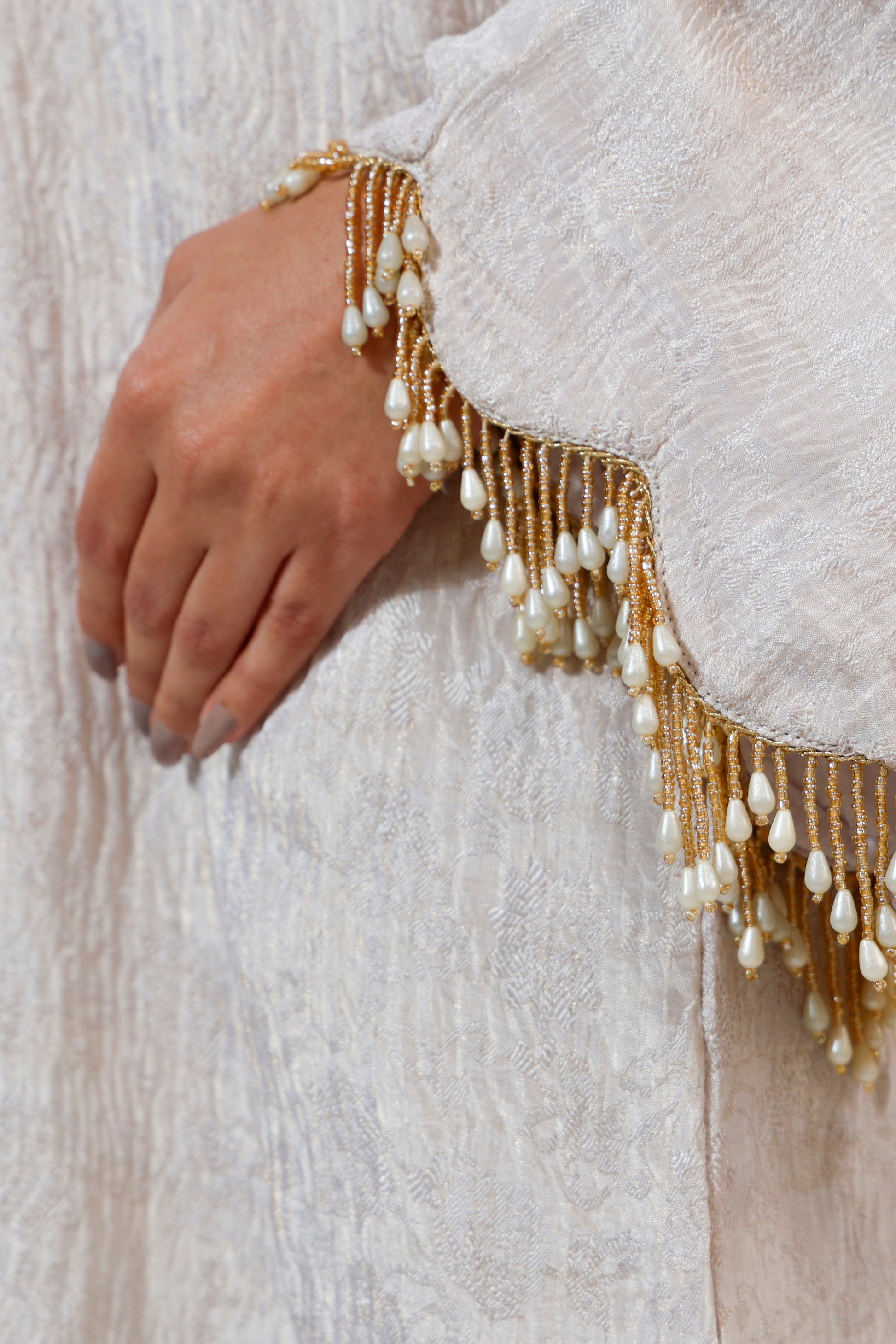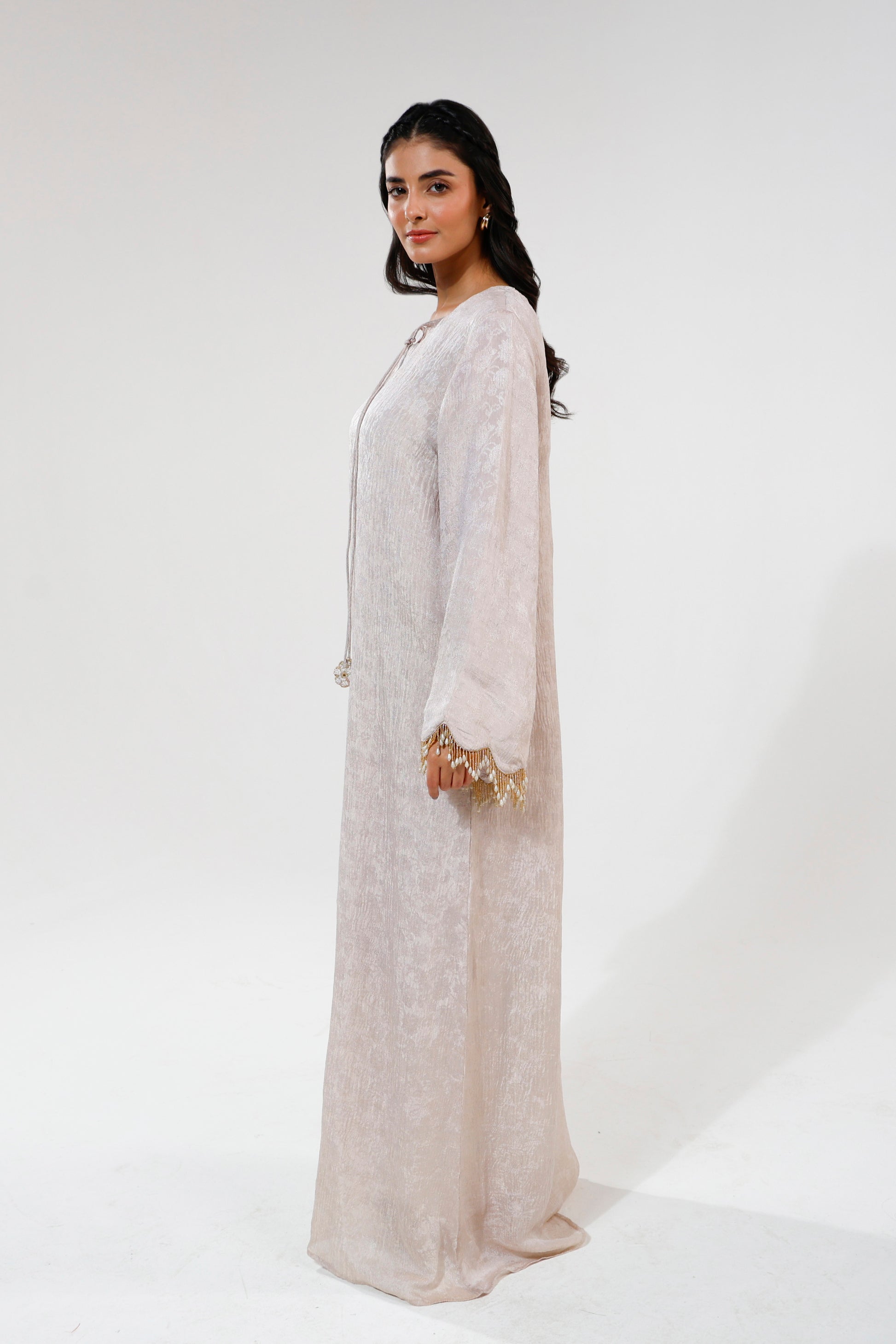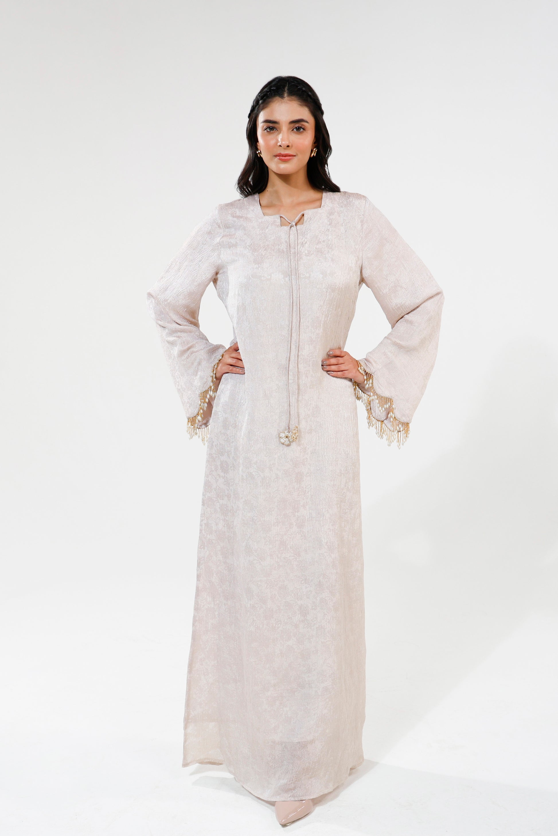 A straight cut mulberry silk, textured light beige dress with a soft square neckline and a subtle opening, finished with a handcrafted crochet tassel. Loose long sleeves with beaded cuff details add movement, creating a calm, fluid, and peaceful look.