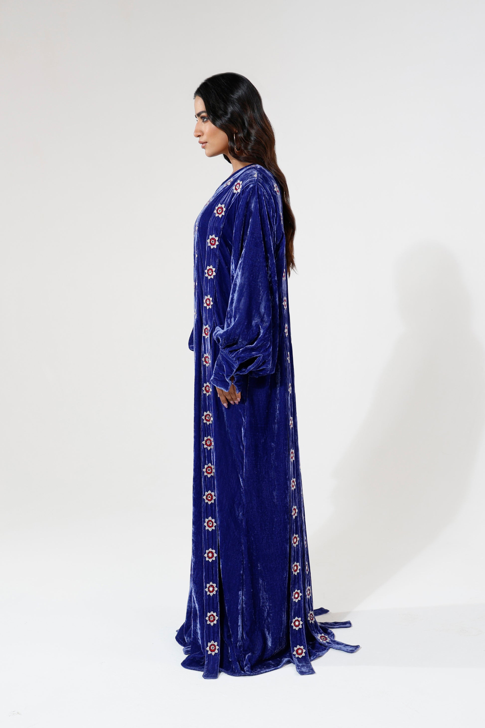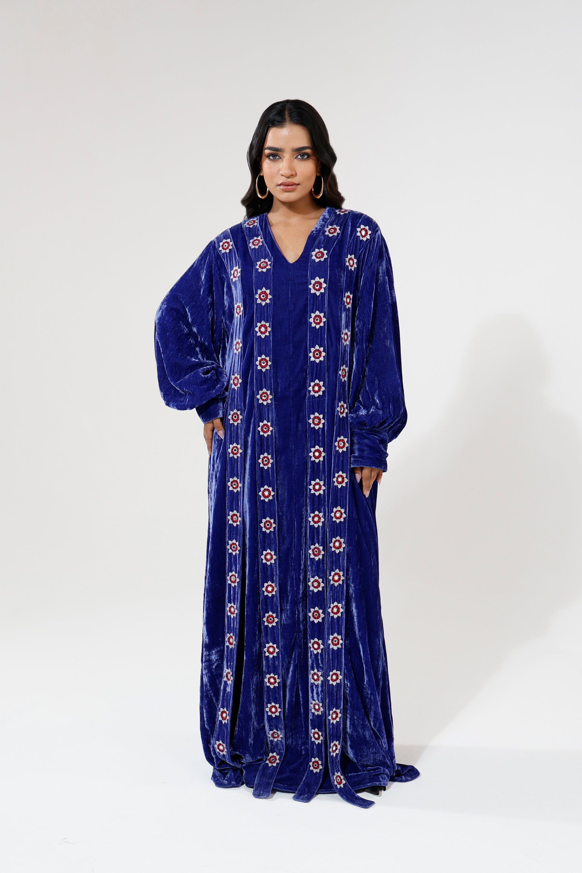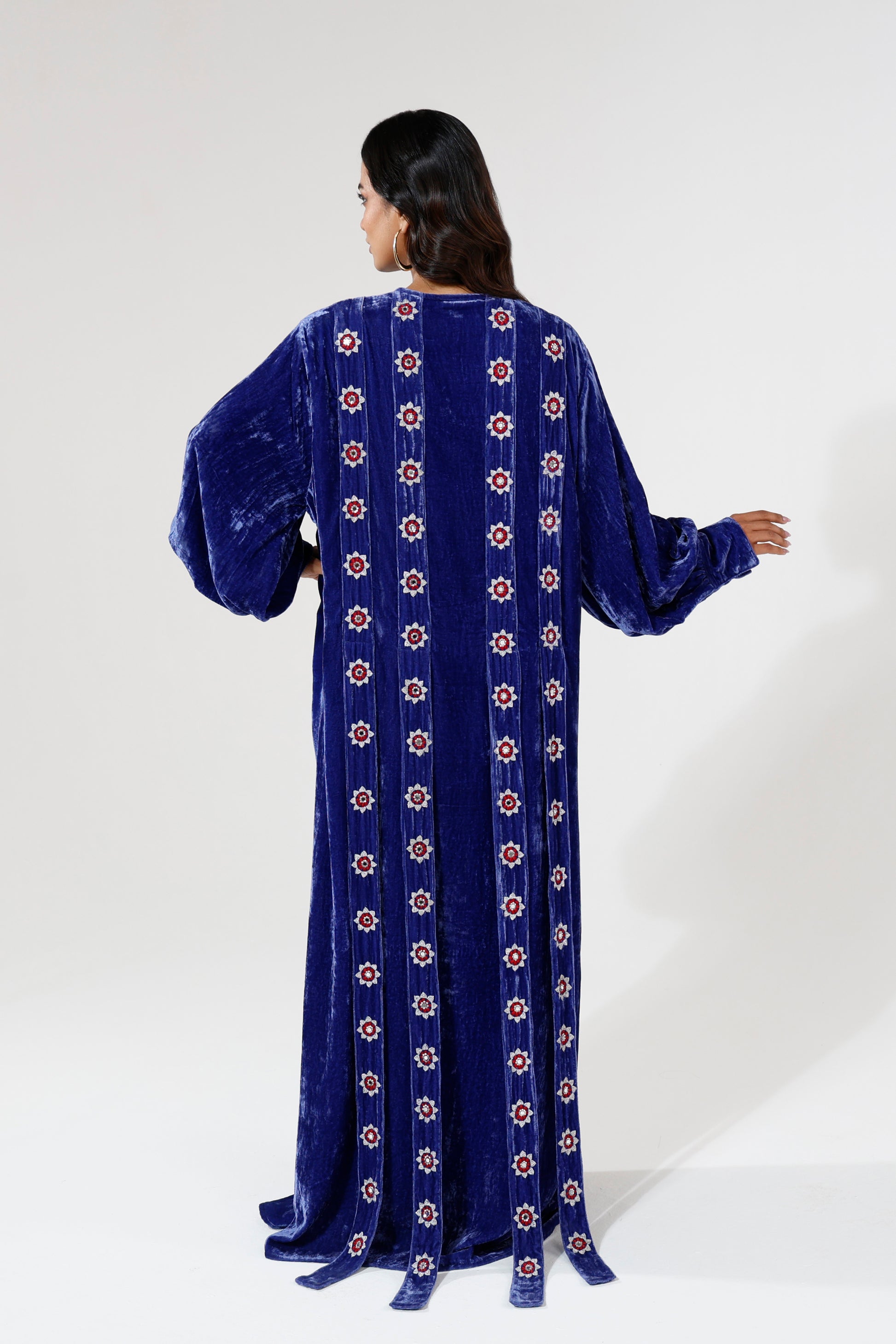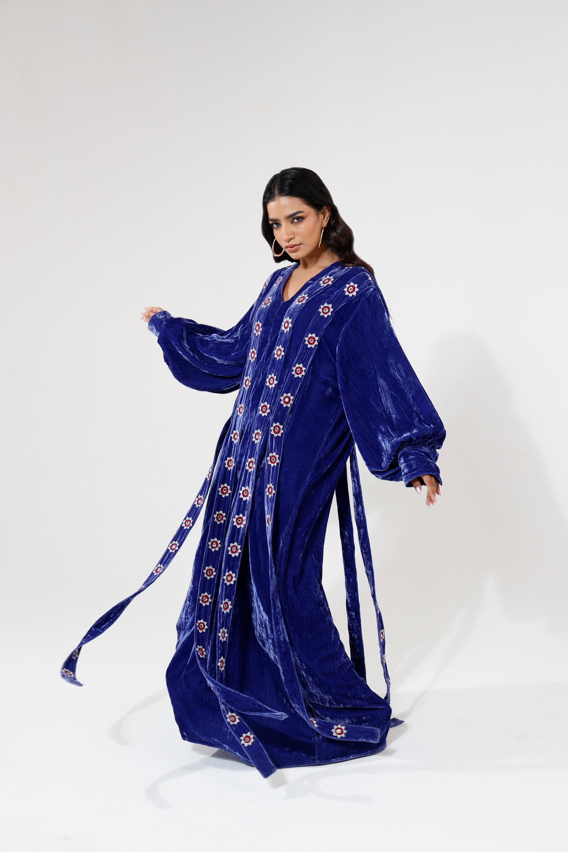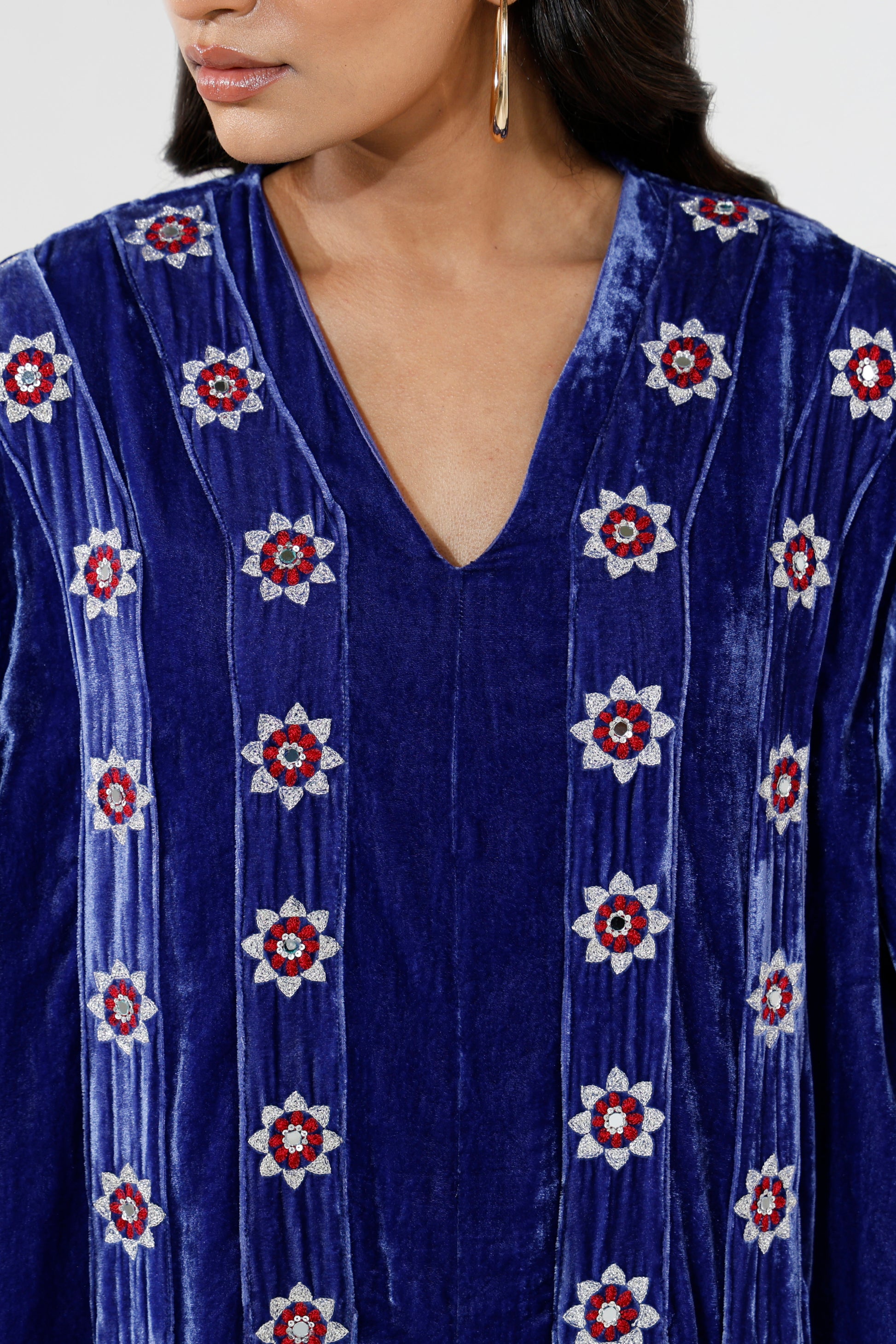 A loose fit velvet dress in a rich royal blue tone, designed with long sleeves and beaded straps embroidered along the body. The relaxed silhouette pairs with detailed surface work to create a look that feels fluid, expressive, and confidently feminine.