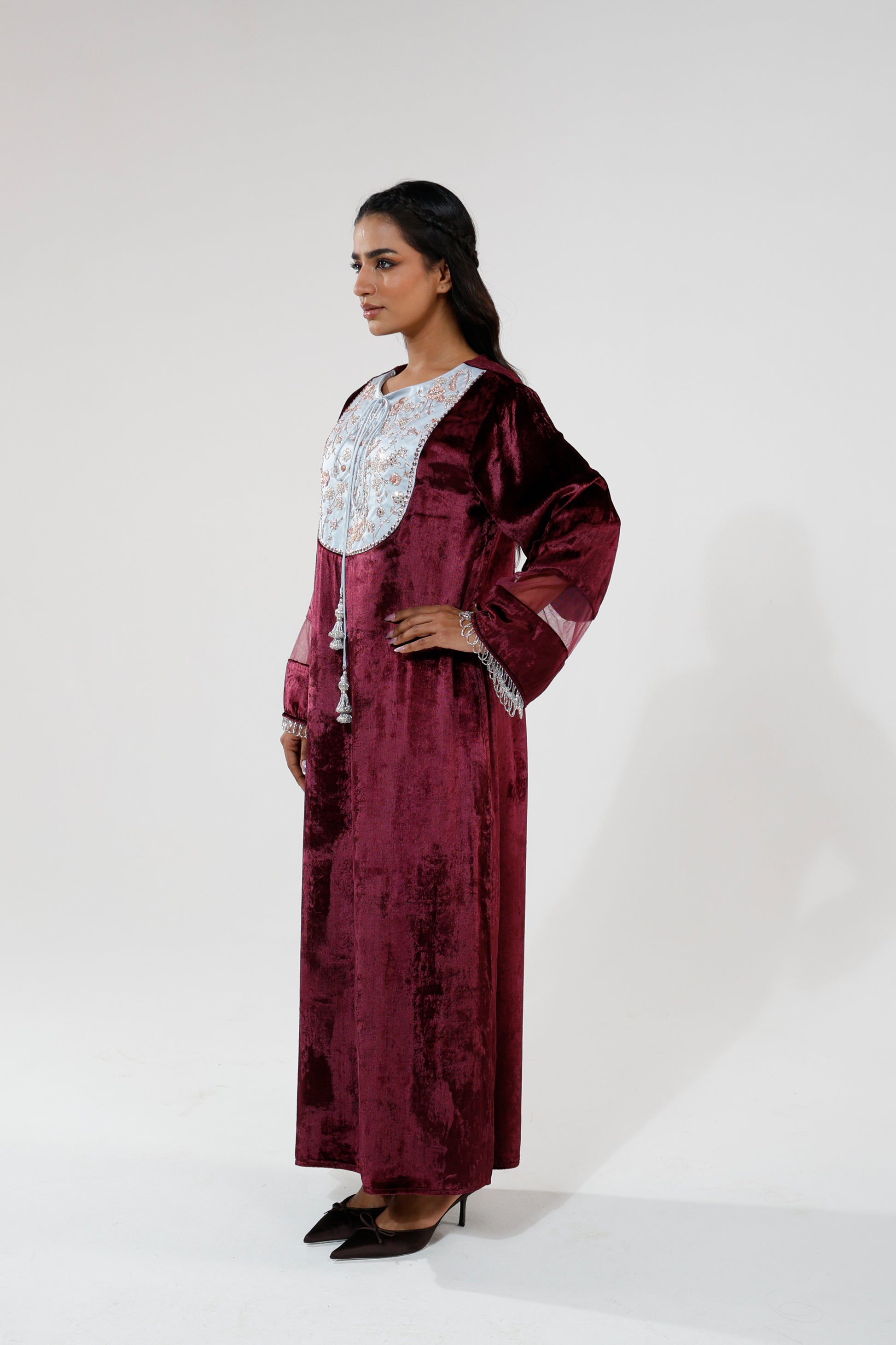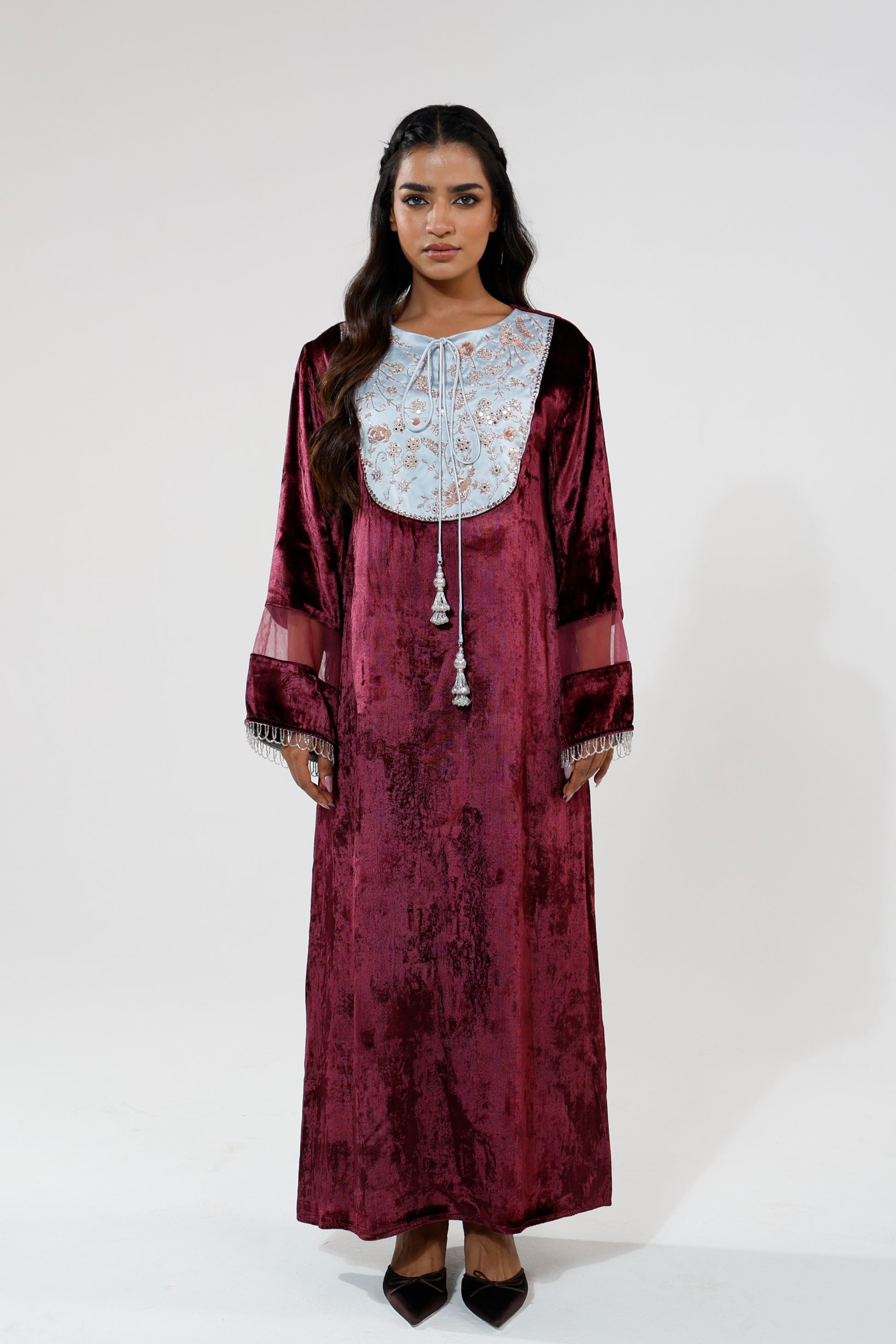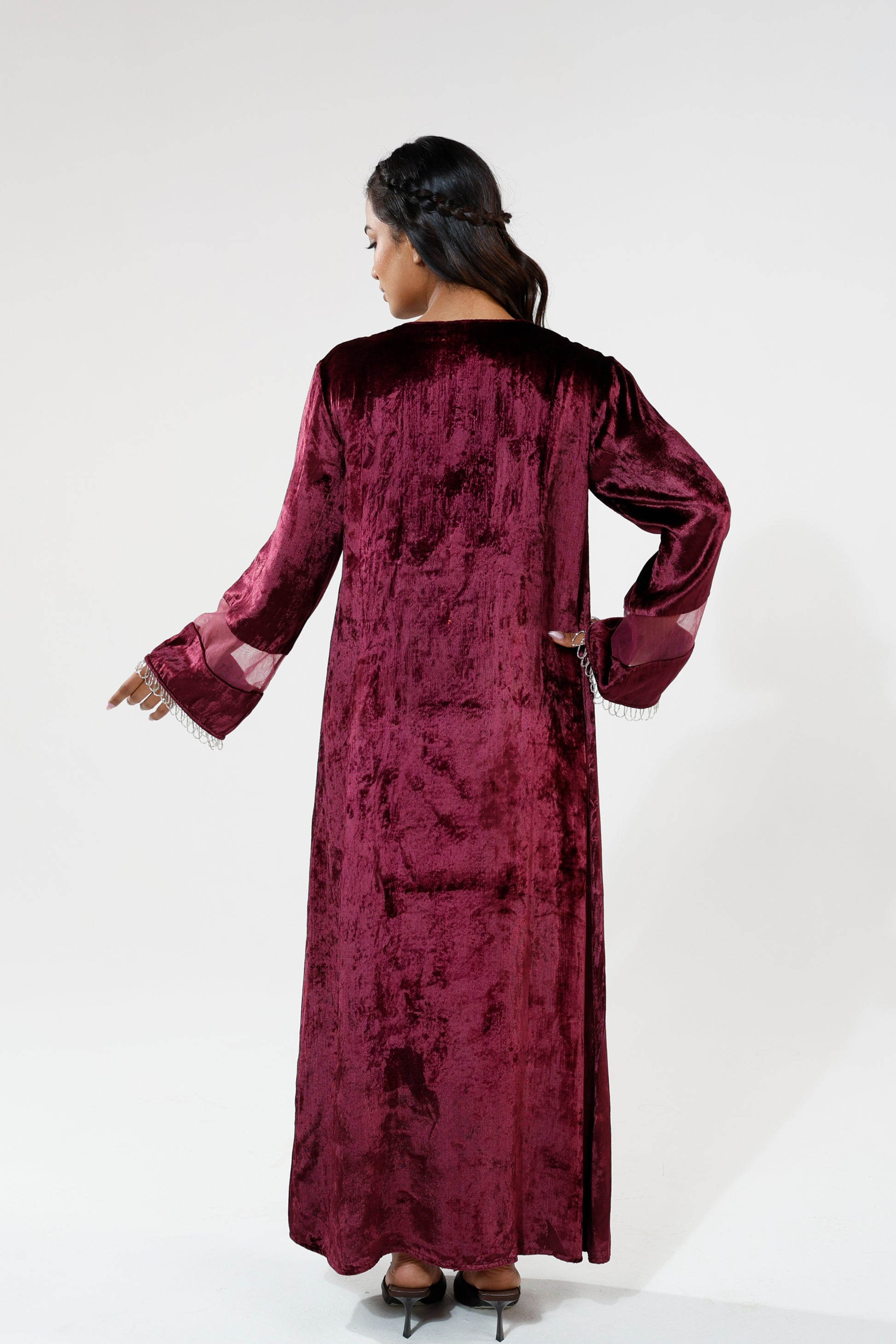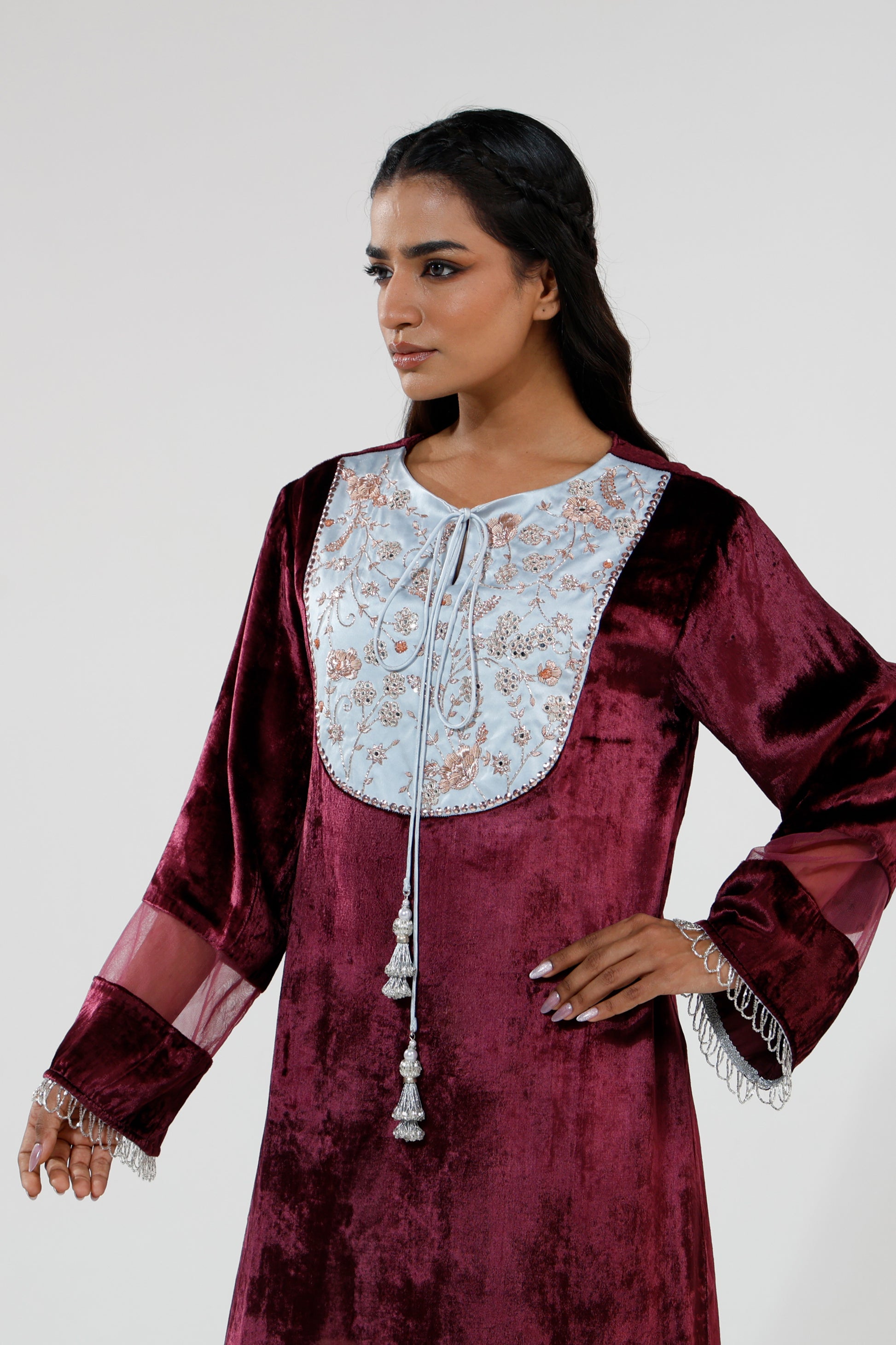 A straight cut velvet dress in a dark burgundy tone, finished with a wide crew neckline and a subtle opening. Mirror and beaded embellishments at the neckline add depth and light, while loose sleeves with transparent accents create a soft layered effect.