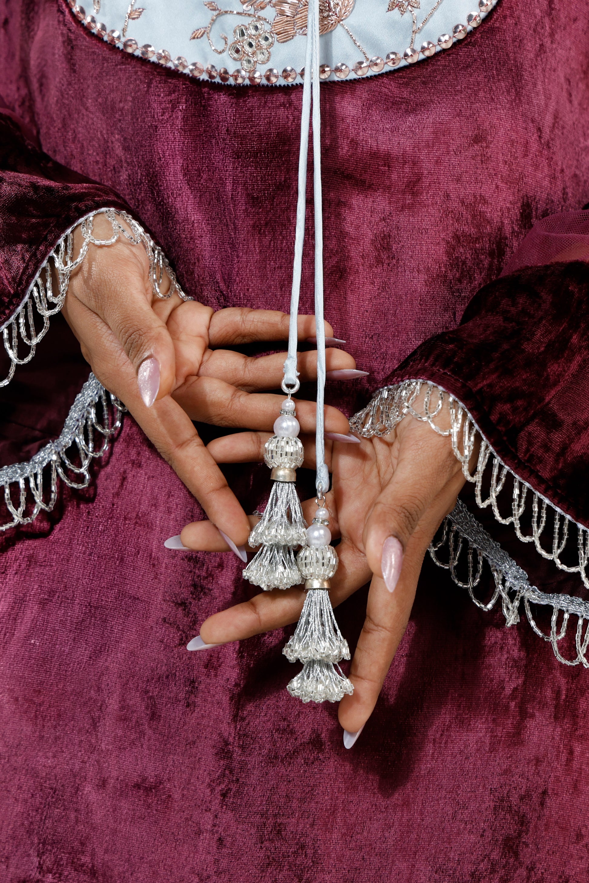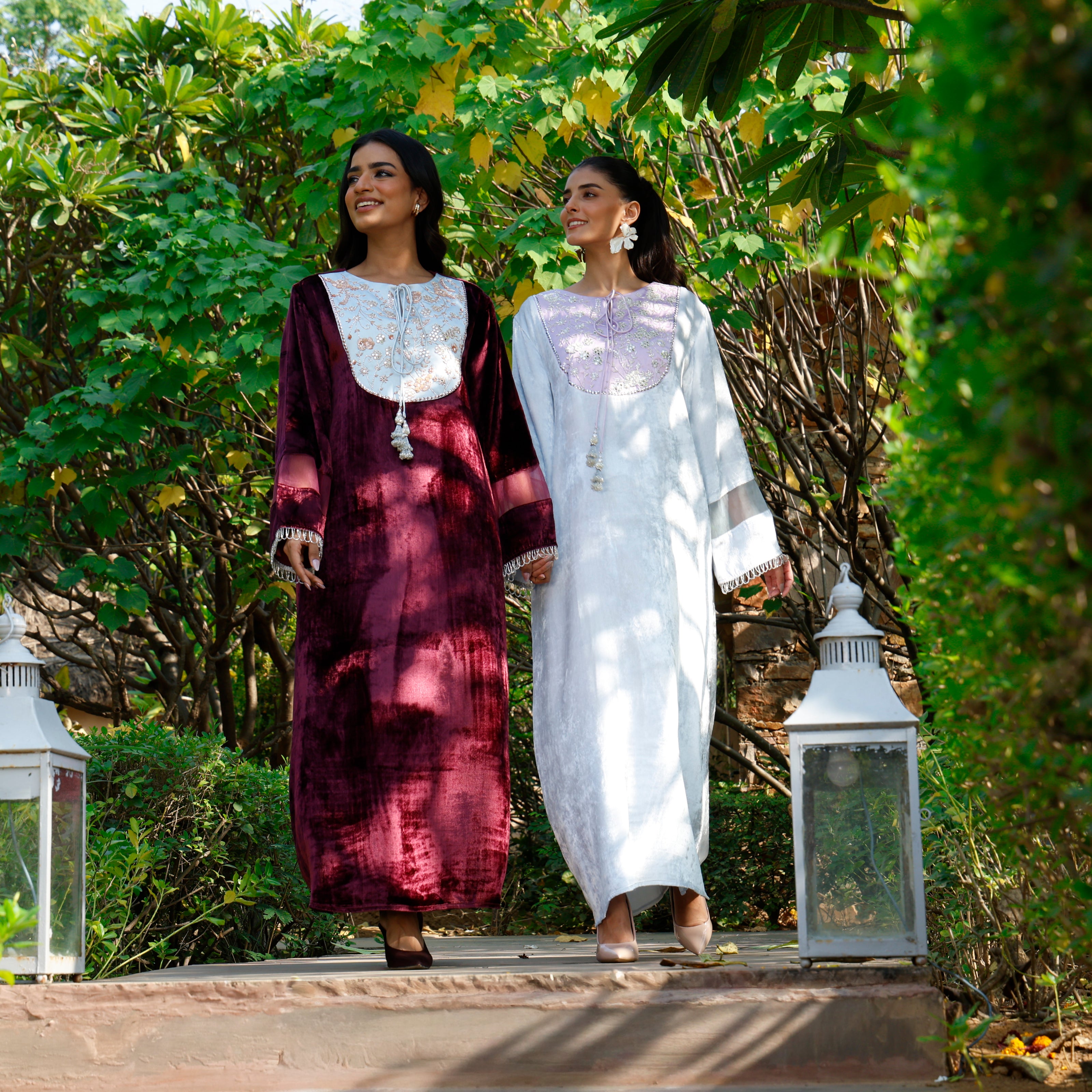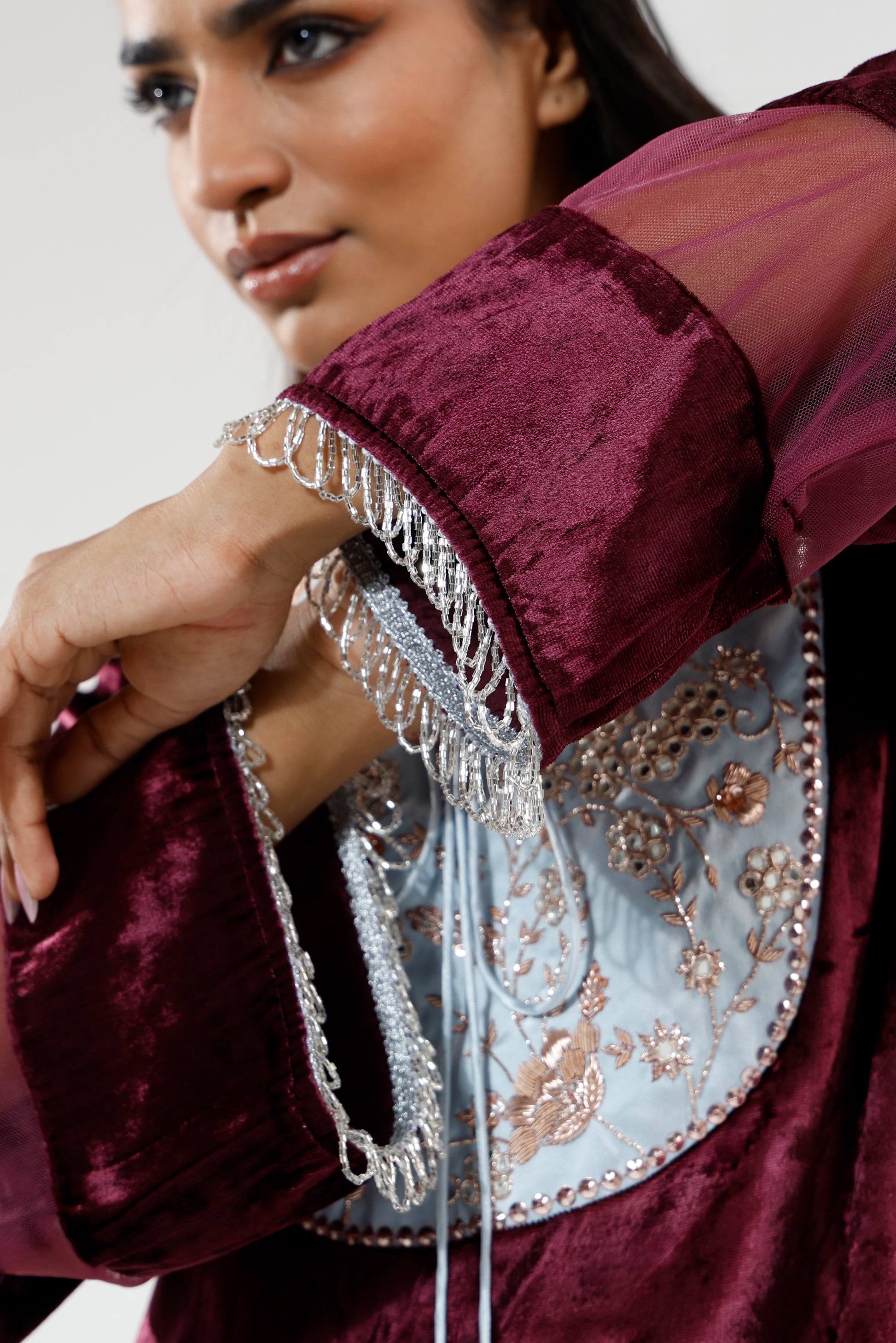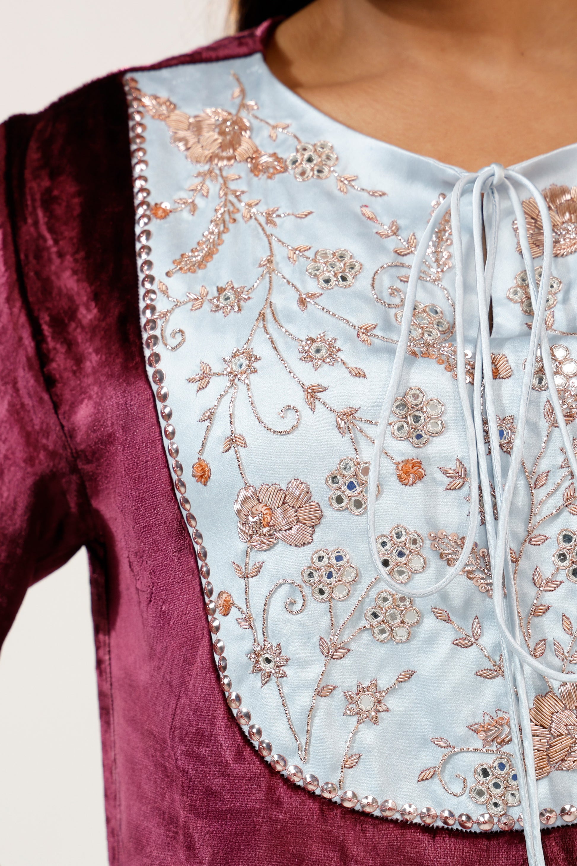 A straight cut velvet dress in a dark burgundy tone, finished with a wide crew neckline and a subtle opening. Mirror and beaded embellishments at the neckline add depth and light, while loose sleeves with transparent accents create a soft layered effect.
