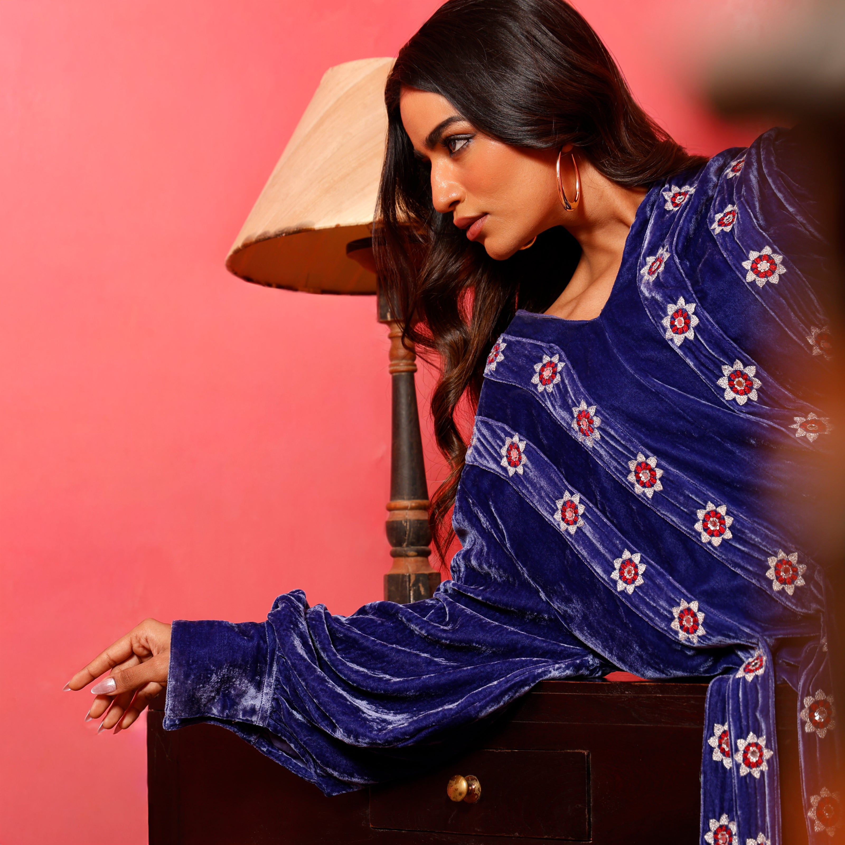 A loose fit velvet dress in a rich royal blue tone, designed with long sleeves and beaded straps embroidered along the body. The relaxed silhouette pairs with detailed surface work to create a look that feels fluid, expressive, and confidently feminine.