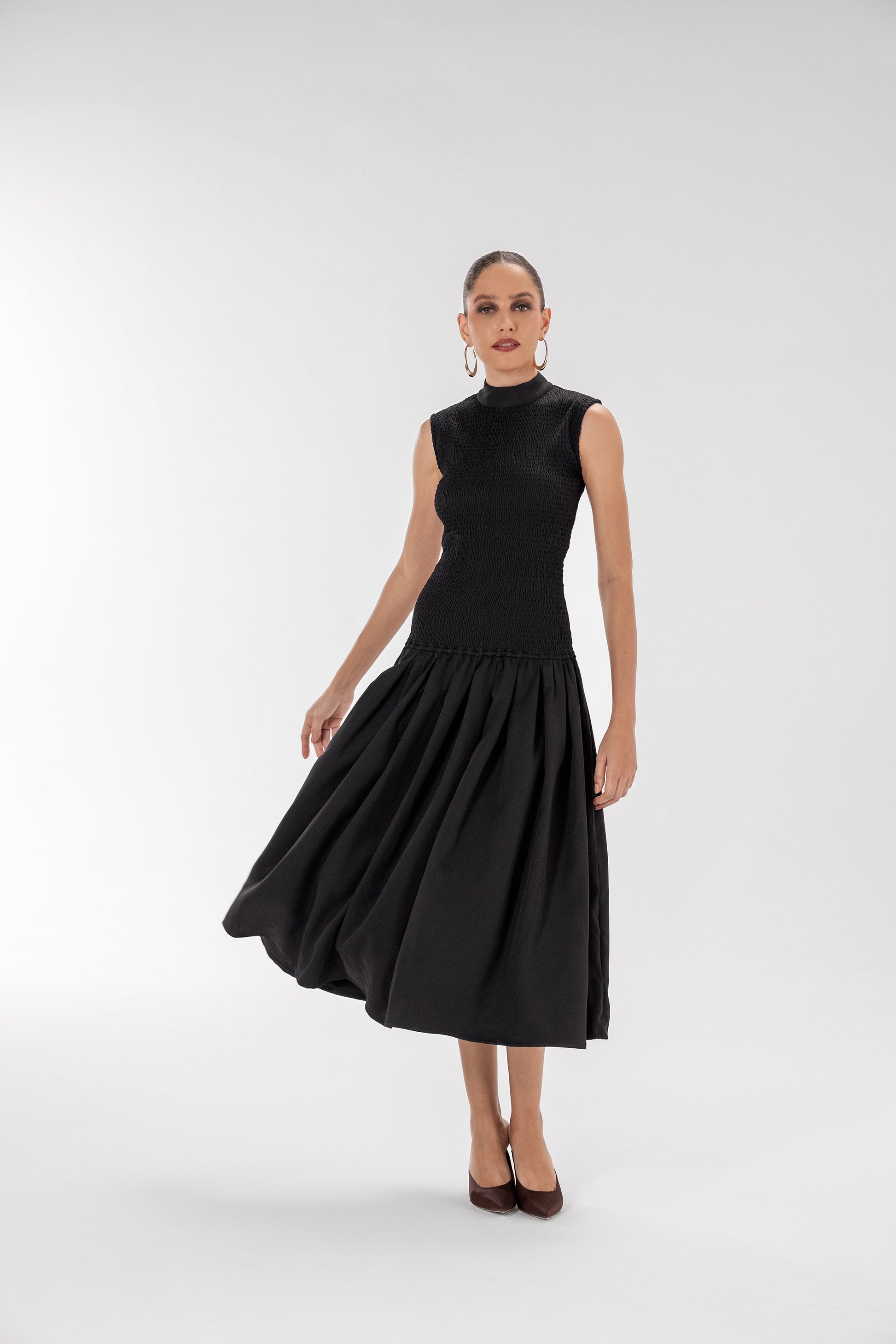 Like a whirlwind sweeping through, this dress brings an energy that captivates and moves smoothly. In rich shades of black and wine, the shirred, elasticated top hugs comfortably with a touch of stretch, while the loose, flowing bottom allows unrestrained movement. Bold, spirited, and free, it's created to turn heads and leave a lasting impression.
